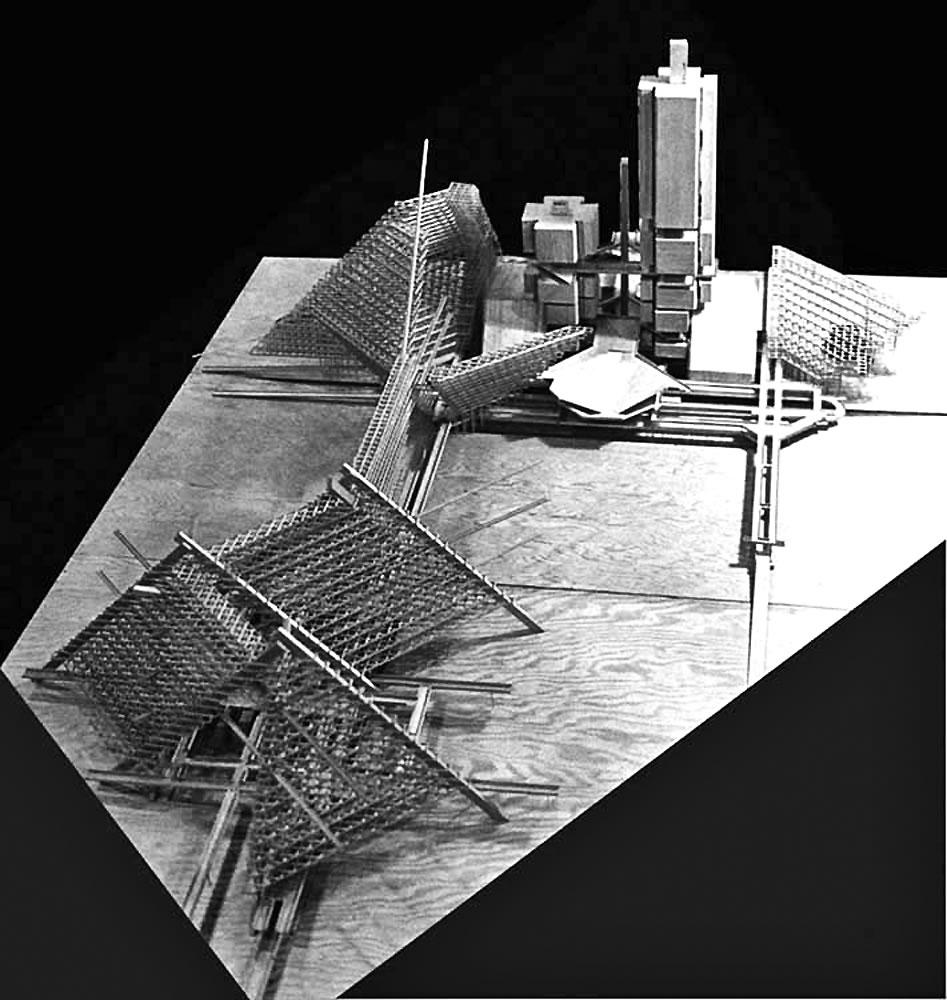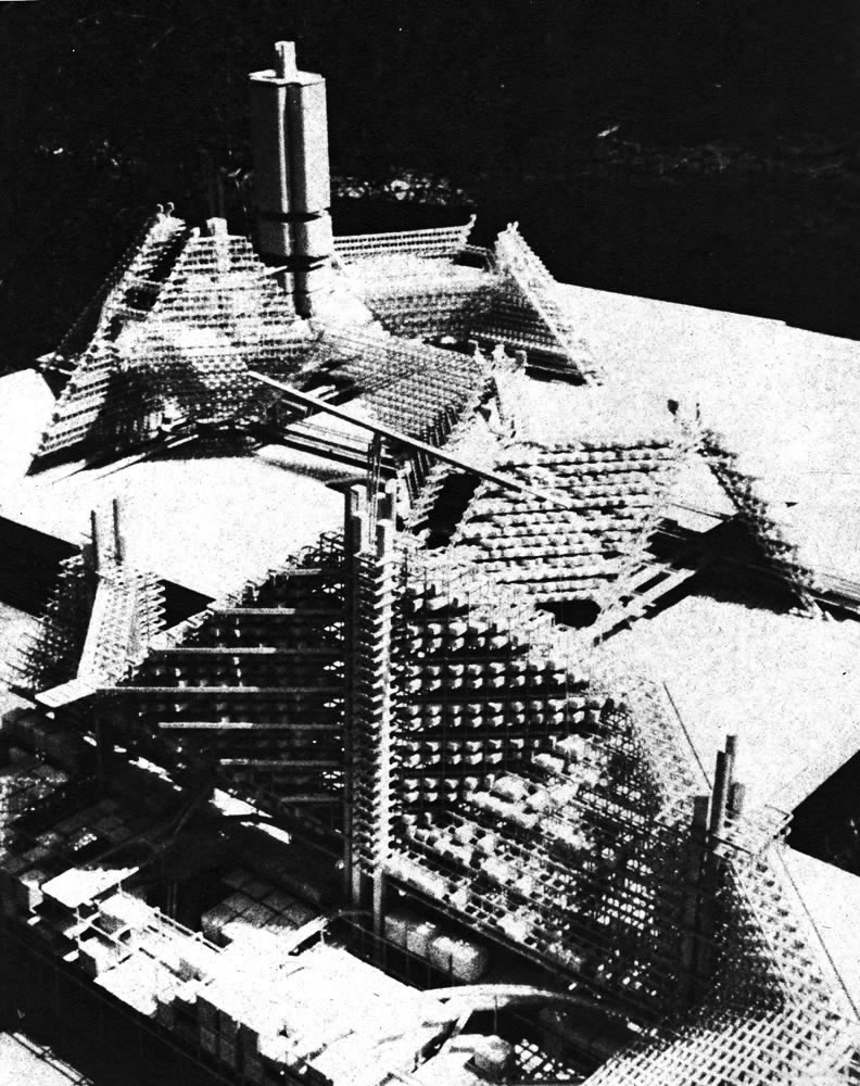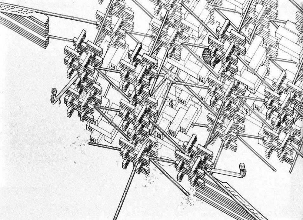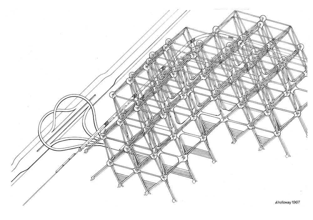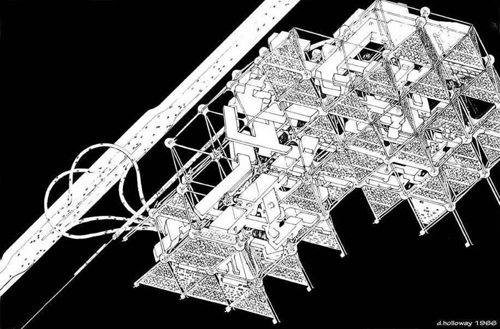 Harvard Grad School of Design extended collaborative team study of 3D Motion Grid City concept. Detail of housing megastructure with housing infill.( Dennis Holloway, 1967).