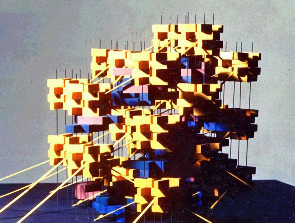 Color model of 3D Motion Grid City Again. Housing on the surface in yellow with other urban functions below in various colors, 1966.