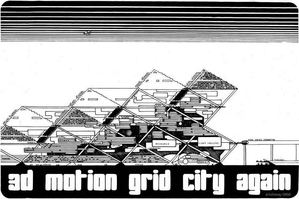 Study of urban three-dimensional spacial uses arranged around, and arganized by, movement path infrastructure with "labyrinthine clarity". From a 1966 diary of Dennis Holloway, with inspiration from Aldo van Eyck, and CIAM Team 10.