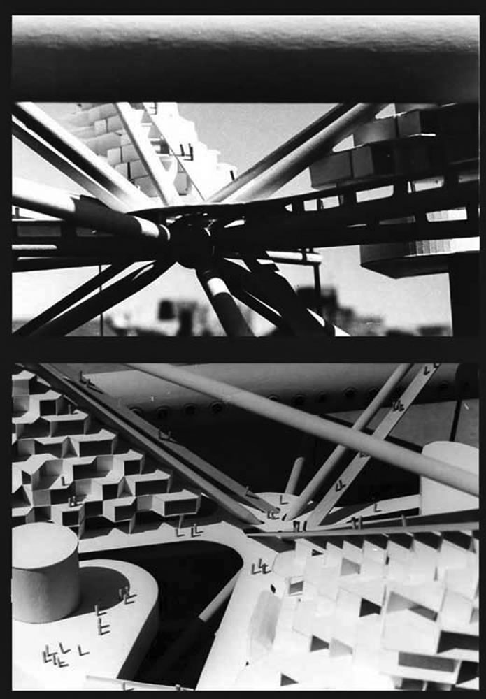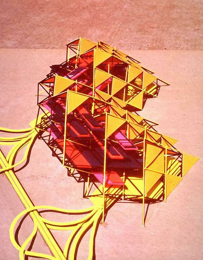 3D Motion Grid City Again was the second semester collaboration of the U.Michigan team, which morphed the circulation matrix from orthagonal (first semester) to tetrahedral. The functions of the City were stratified by the need for, and relationship to, daylight and solar energy, with housing on th exterior surface of the City, and other uses arranged as required on lower levels. The 3D City reorganized the urban idea, by leaving the natural landscape free for recreation and agriculture, while increasing dense clustering of all urban functions into megastructural island-mountains, connected by a high-speed transit grid.