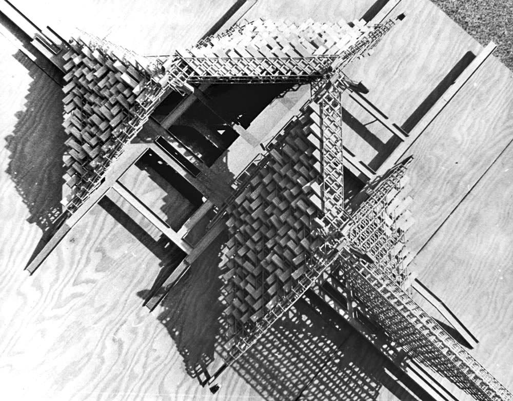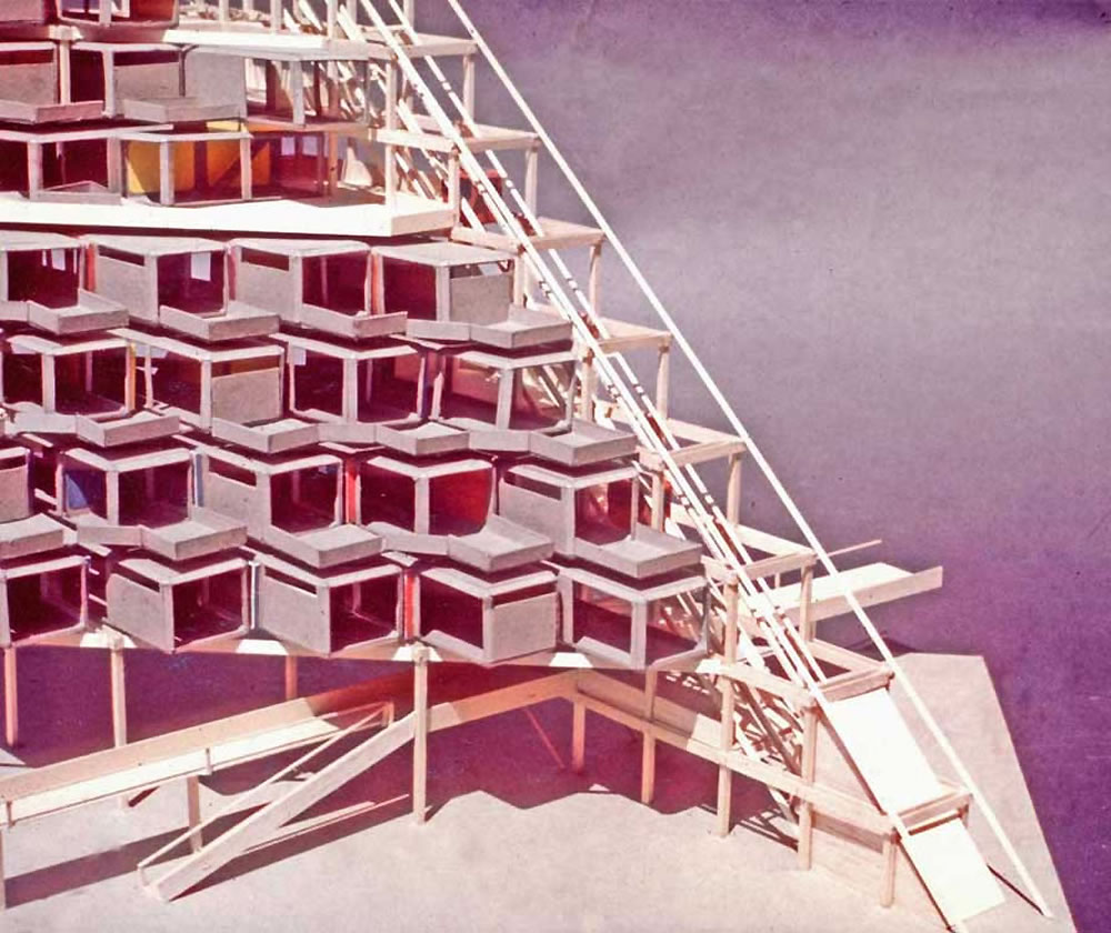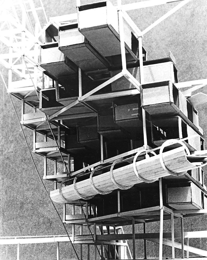 Harvard Grad School of Design extended collaborative team study of 3D Motion Grid City concept. Detail of housing megastructure with housing infill. (D.Hafner, D.Holloway, D.Stanek, 1967)