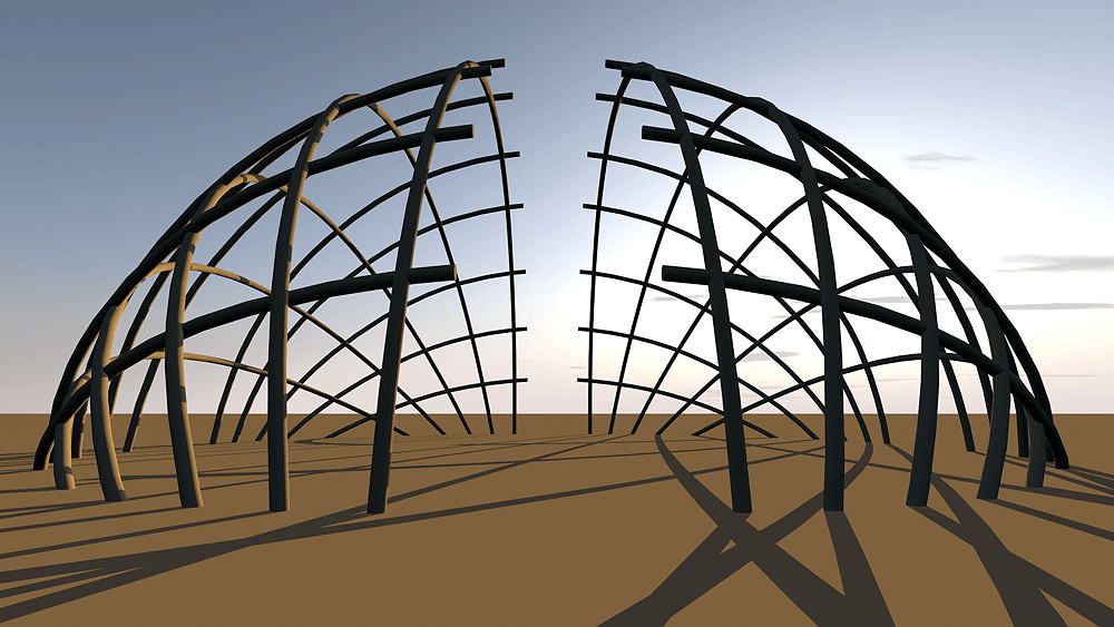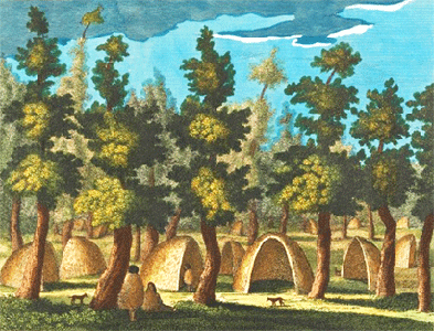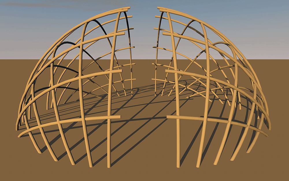 Yaghan and Alakaluf Cultures of Tierra Del Fuego, the southern most island point in the Americas, Chile and Argentina; house type still in use. The ancestors of these peoples are being studied as possibly the earliest inhabitants in the Americas, perhaps dating to 50,000 BCE. They may have originated from Australia, not traveling across the land bridge as with other indigenous tribes of the Americas. Their art is similar to aboriginal Australians and that found in northern Brazil. They wore little clothing and, over a long time period, adapted their metabolism to the harsh, often cold, climate of Cape Horn by painting their bodies with animal grease, and huddling around small fires in their heat-focusing spheroid houses. Early passing Europeans called these islands Tierra Del Fuego (land of fire) because the many small fires seen on the shores. Elevation near sea level along the coast. Materials: tree branches forming half domes; animal skins and thatch roofing. Data for CG model: |