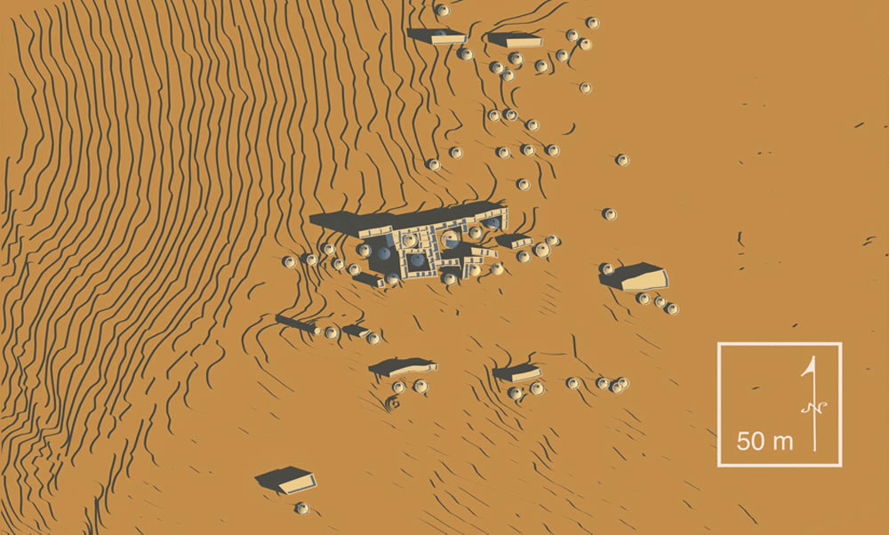 Materials: mortarless stone walls, wood log roof support structure, with mud/clay roof over sappling mats.