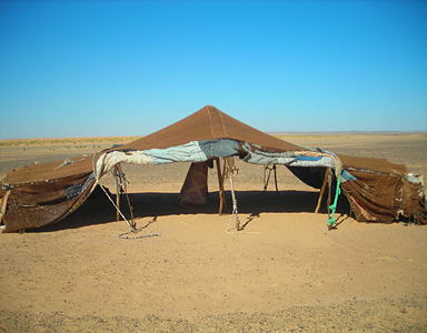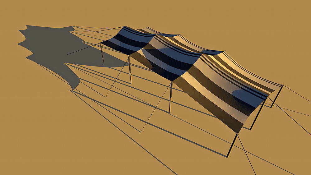 Bedouin Culture, Arabian and Syrian deserts, from c. 2000 B.C.E., still in use. Materials: short wooden support posts, framework of tightly stretched goat-hair ropes, over which a loosely woven goat-hair cloth (fala'if) is stretched to serve as walls and roof. The membrane breaths, but is also waterproof. Data for this CG model: |