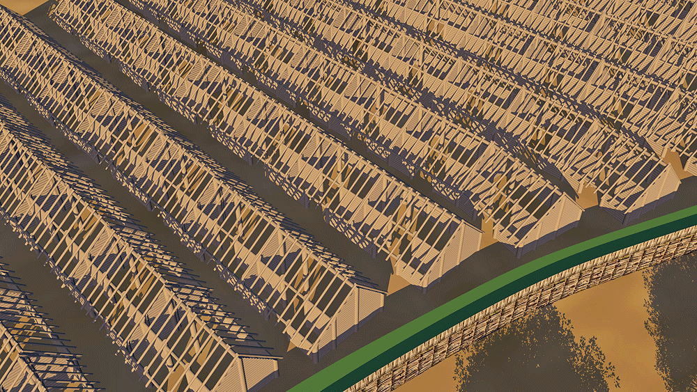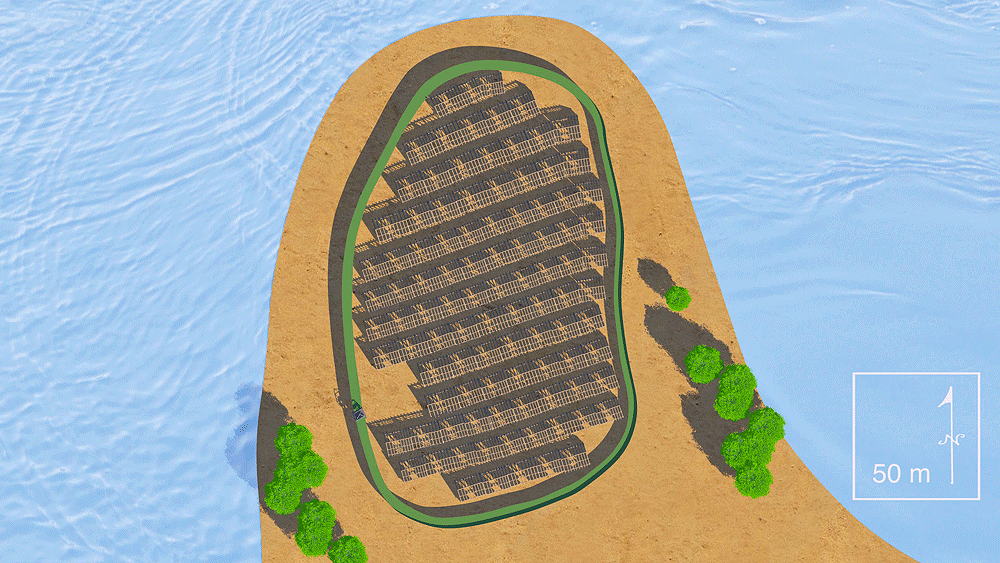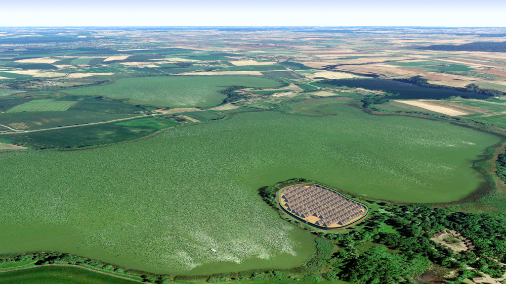 Photomontage of Biskupin fort upon aerial photo of actual lake site in northern Poland.