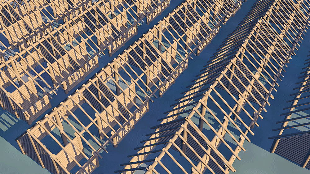 Materials: wood construction columns, beams, wall and roof construction; thatch roof.