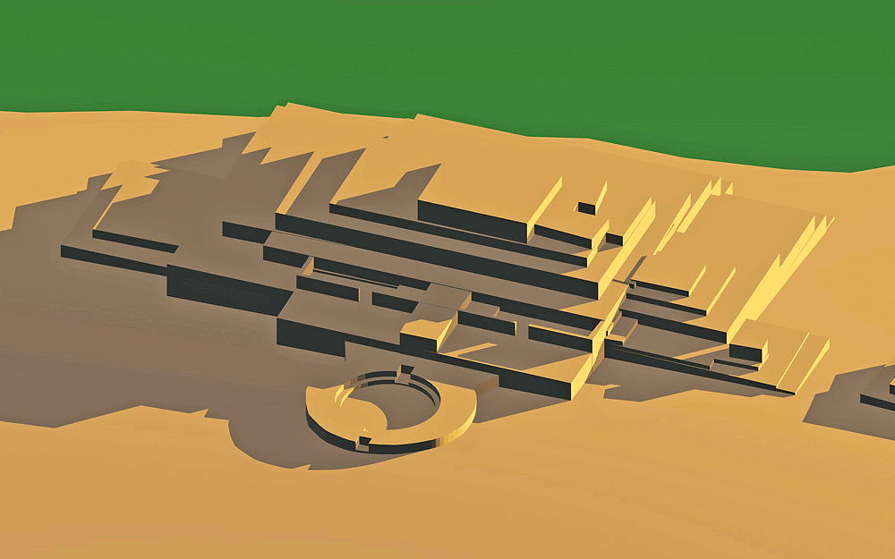 Norte Chico Civilization, occupied between 2600 B.C.E. and 2000 B.C.E.; located 200 km north of Lima, in the Supe Valley, near Supe, Barranca province, Peru; Caral pre-dates the invention of ceramic pottery by six centuries, and may be one of the oldest centers of civilization in the Americas, dating approximately 4000 years before the Incan Empire reached its power—"America's mother city" The pyramids of Caral may be older than those in Egypt. Caral remained hidden under sand dunes until discovery by Ruth Shady in 1996. The city covered 1500 acres, had a population of thousands, with six pyramids, sunken circular courtyards, mud brick platform mounds and monumental stone architecture, and remained a vital war-free zone for 1000 years. The people grew cotton in the river valley, and innovated the weaving of fish nets, which they traded for sea food from the coastal tribes, who harvested the rich Humbolt Current upwelling. The Carolinas are the genetic ancestors of people all over South America. Caral is a UNESCO World Heritage Site since 2009. Elevation is 355 meters (1164 feet) above sea level. Data for CG model: |