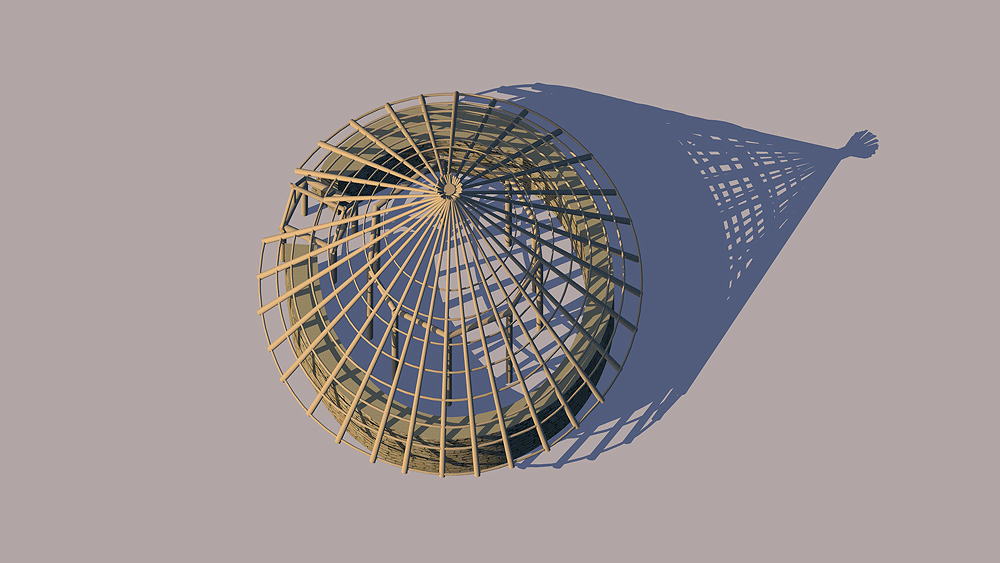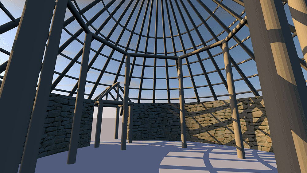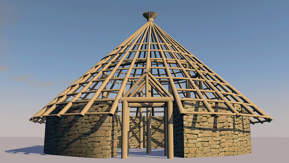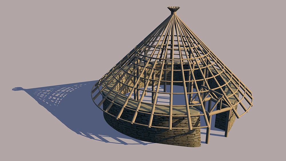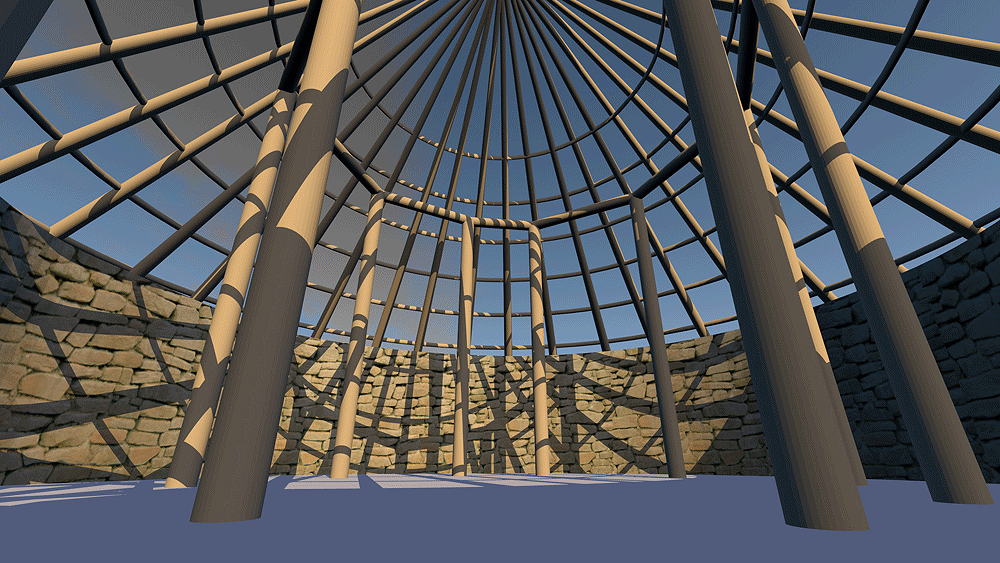 Materials: stone ring wall; wood columns and beams; wood roof purlins; thatch roof.