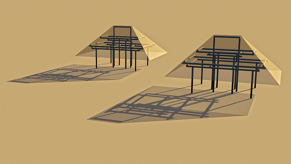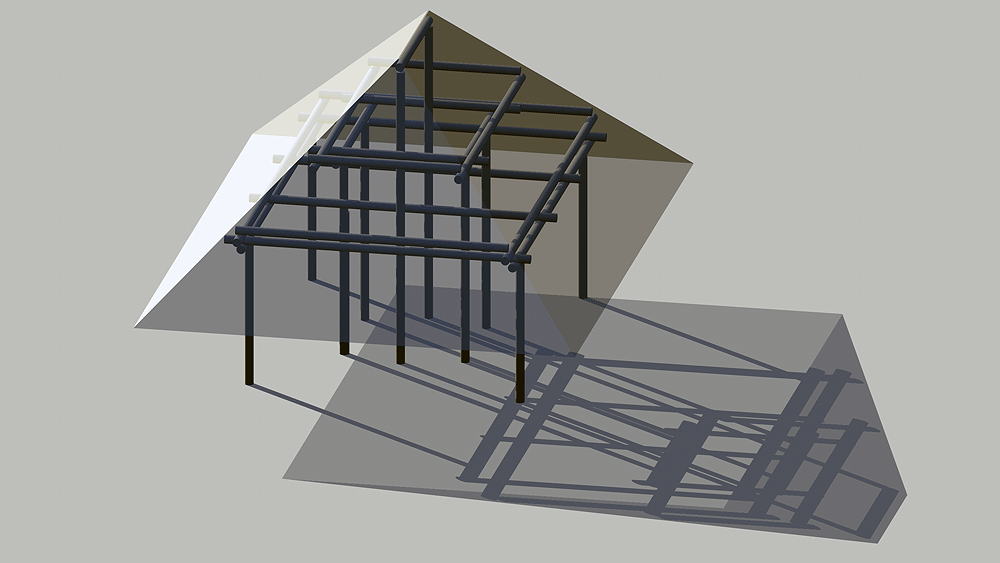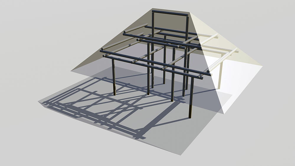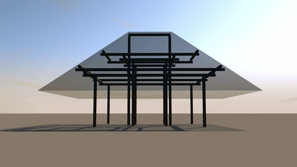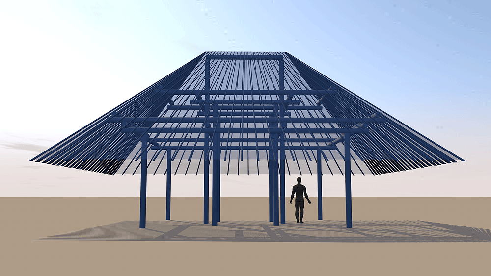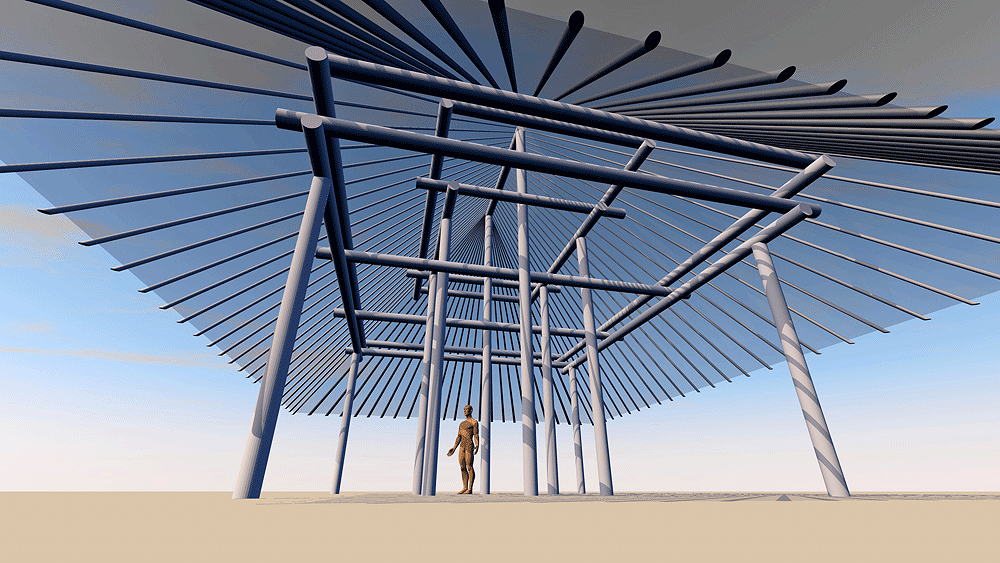 Desana Maloca Desana Culture, traditional multi-family longhouse in Colombia, Panama, and Brazil, still in use. Elevation varies c. 122 meters (400 feet) above sea level. Materials: Wood columns; wood beams and purlins roof structure; thatch roof. Data for CG model: