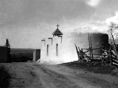 The "twin" adobe buttresses and semi-circular apses of New Mexican chapels inspired the design for this professional building commissioned by Michael McGowen and Paul Lukes. On the left: Chamita, San Juan Pueblo,NM. On the Right: Llano Quemado,near Ranchos de Taos, NM. |