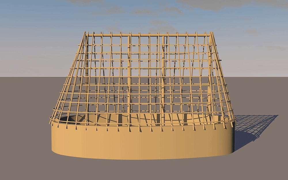 Villanovan Culture, Iron Age central and northern Italy (Eastern Tuscany), 1300 B.C.E. to 750 B.C.E; data from excavation of two huts in the ruins of the Etruscan city of San Giovenale. Elevation is c. 200 meters (656 feet) above sea level. Materials: wood posts and roof beams, wattle and daub walls and a thatched roof Data for CG model: |