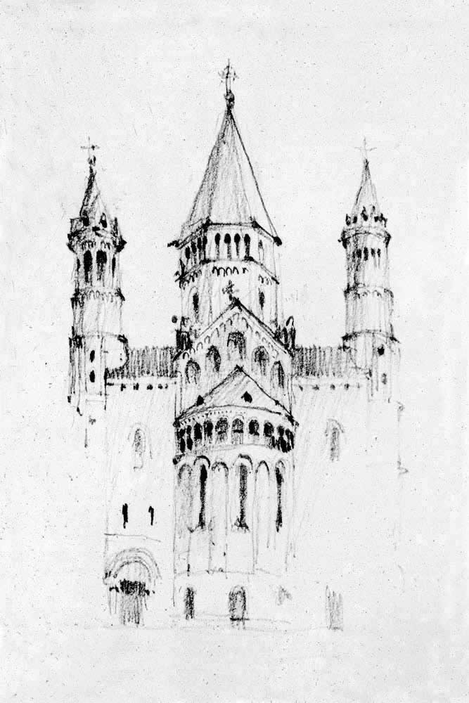 Mainz Cathedral, Germany, west facade study, Sumner, 1965, #2 pencil on bond.