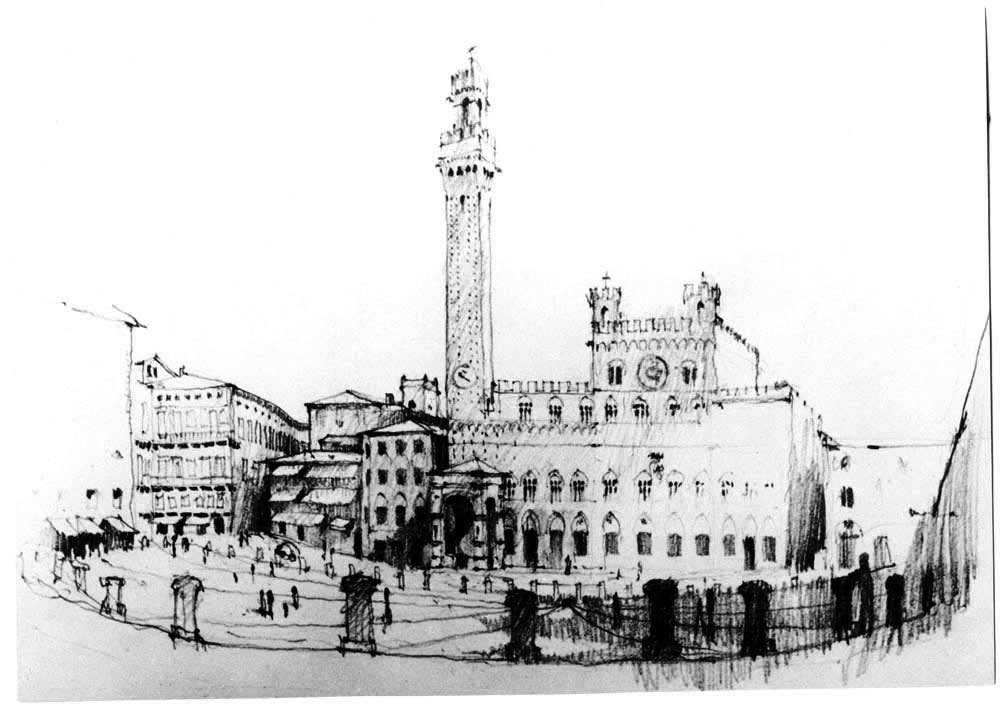 Piazza del Campo, Siena, Italy, forced perspective, Summer 1965, #2 pencil on bond.