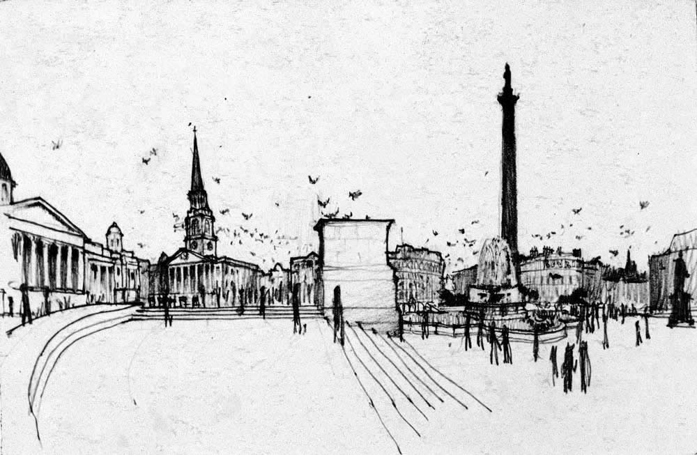 Trafalgar Square, London, England, forced perspective, Summer, 1967, #2 pencil on bond.