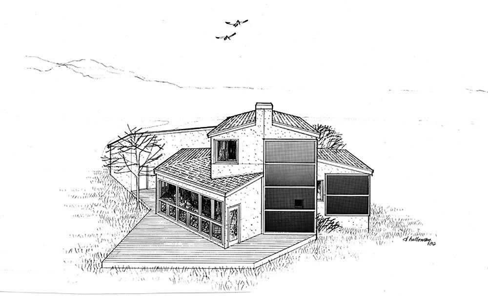 This design for a three bedroom two storey home incorporates Trombe walls and direct-gain passive solar fenestration.