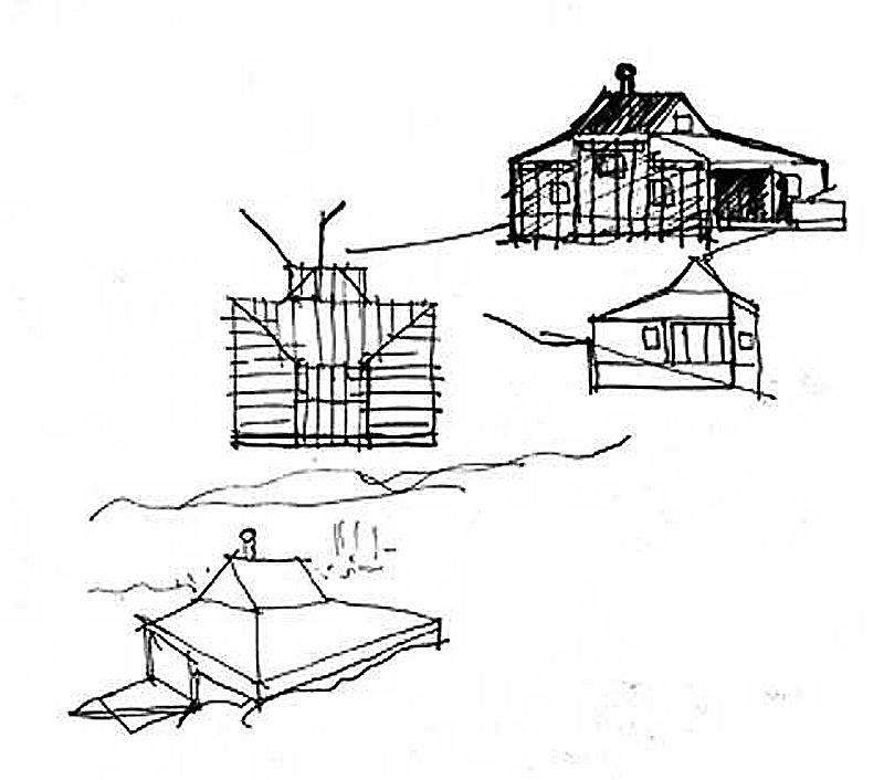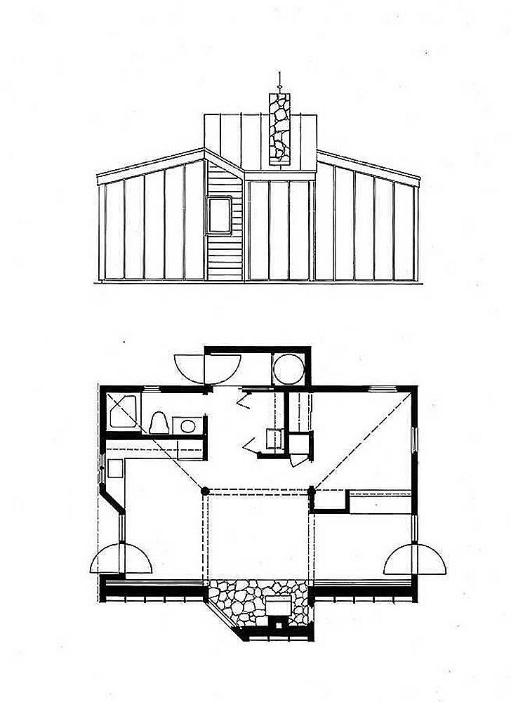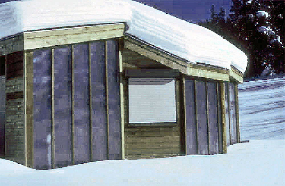 Flock Off-Grid Cabin, Somewhere in the Rocky Mountains, Colorado Located on property located at 10,000 foot elevation and with winter access only by cross-country skis, the Flock cabin is off-grid, incorporating Trombe walls and a wood burnng stove for heating of the 600 square foot floor plan. |