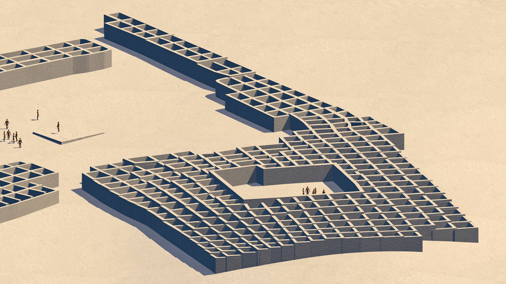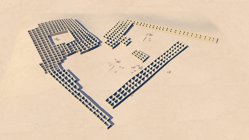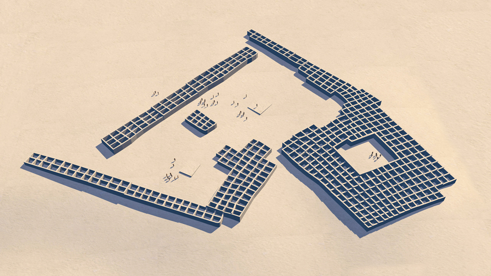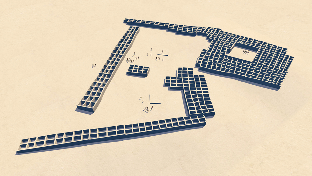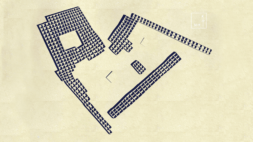 Plan view with scale and orientation. Data source for this CG model: 1. Spier, Leslie, 1918 . "Notes on Some Little Colorado Ruins", Anthropological Papers of the American Museum of Natural History, vol 18, pt 5. 1918. 2. Shumway Archaeologica Project: https://www.uvm.edu/~svankeur/SHAP/project_area/fourmile_ruin/fourmile.htm 3. Johnson, Douglas, 2022. Adobe Brick Architecture and Katsina Ceremonialism at Fourmile Pueblo. Second Books, Albuquerque, NM, 2022.