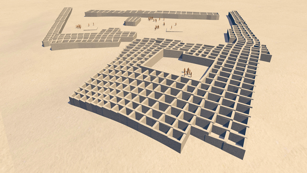 Above: Photomontage of Fourmile Pueblo CG model over aerial photo of actual site on a dry Silver Creek during drought, looking west. Fourmile Pueblo is, with 450 rooms, the largest of the pueblos of the Silver Creek drainage of the Little Colorado River in east-central Arizona. Like other pueblos in the Silver Creek vicinity, it was constructed around 1275 CE. And all of these pueblo ruins have been abused by the bulldozers of pot hunters, makiing archaeology of these ruins very challenging. The people of Fourmile Pueblo lived there through a great drought in the 1200sCE and stayed on until an even worse drought of the 1300s. Around 1400 CE, after that terrible century, they abandoned the Silver Creek area, and migrated south to Tonto Basin, Safford Basin and the Lower San Pedro Valley. Archaeologists have traced this migration through the ceramics they left on their way, and the resulting influence they had on the ceramics that produces in their final destinaltions. Jesse Fewkes excavated Fourmile in 1897 and the large collection of ceramics he found is now housed in the Smithsonian Institution. Elevation is 1743 meters (5720 feet) above sea level. Coordinates: 34°27'55.9"N 110°08'04.9"W Materials of construction: Systematically organized adobe and stone masonry with mud mortar, tree log roof structure supporting mud/clay roofing over tree sappling mats.