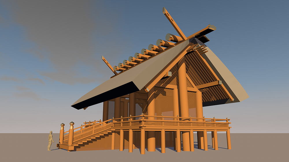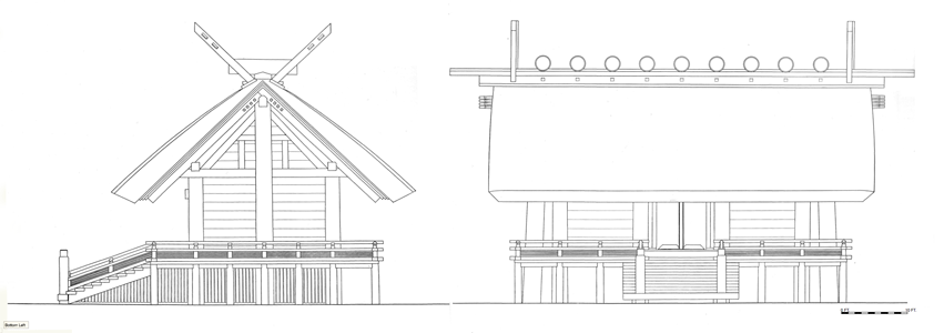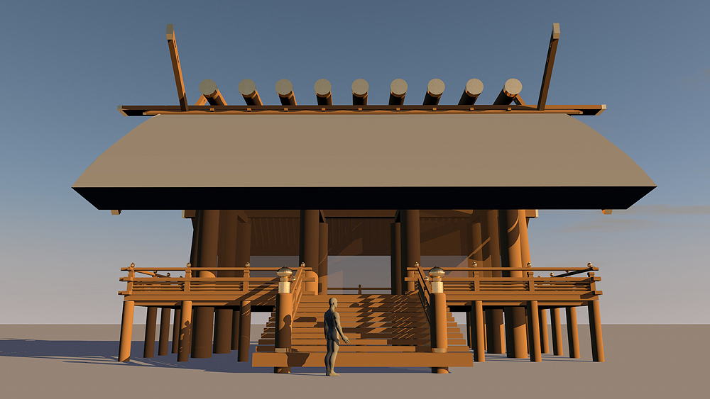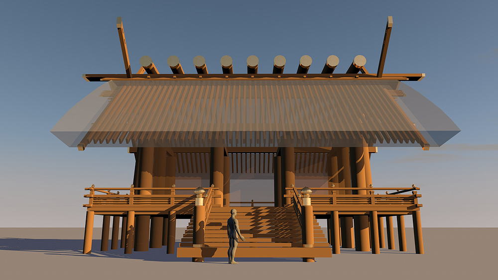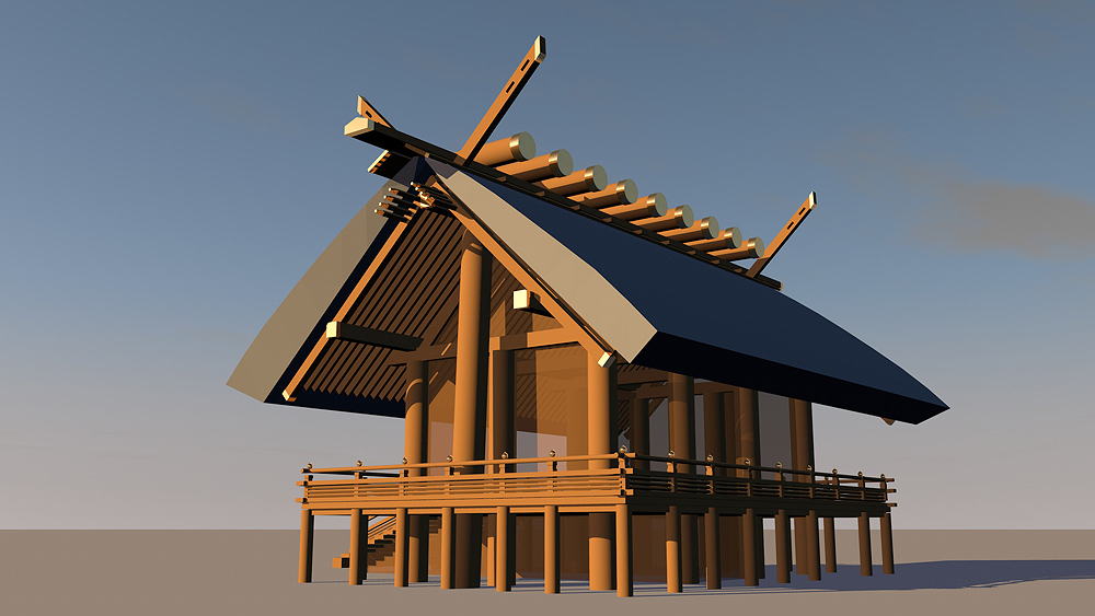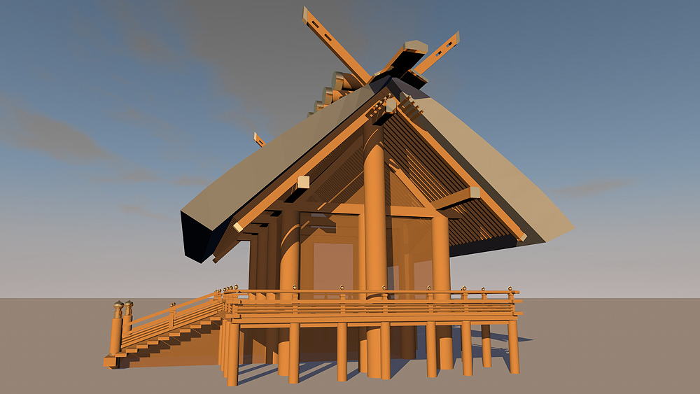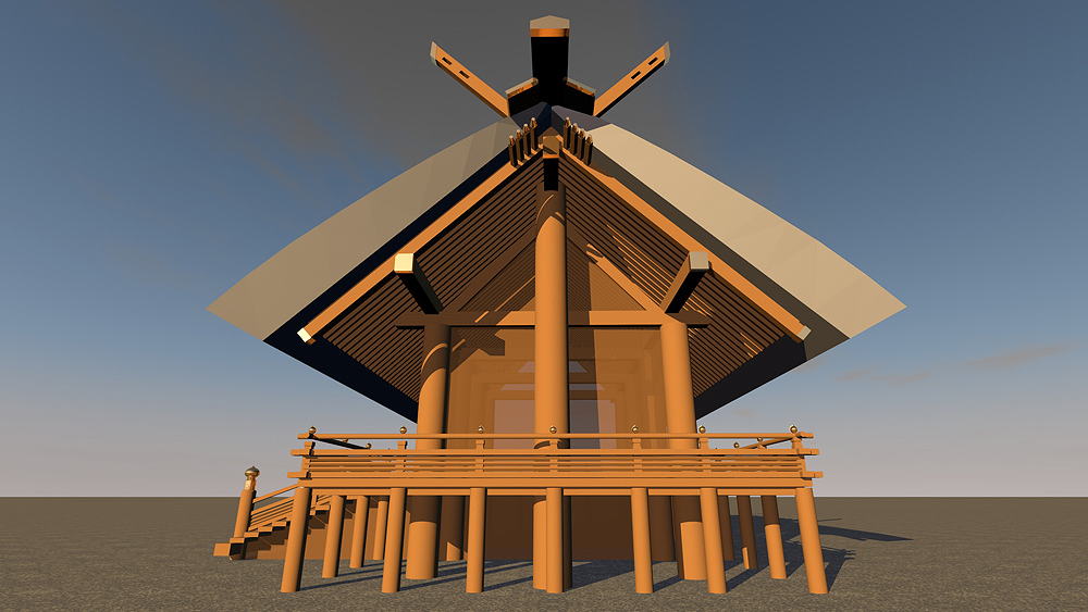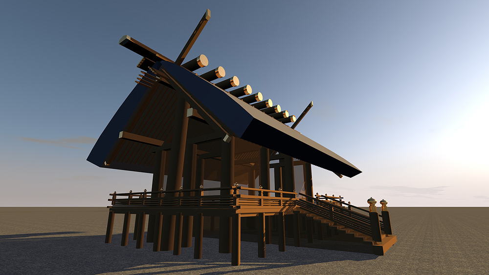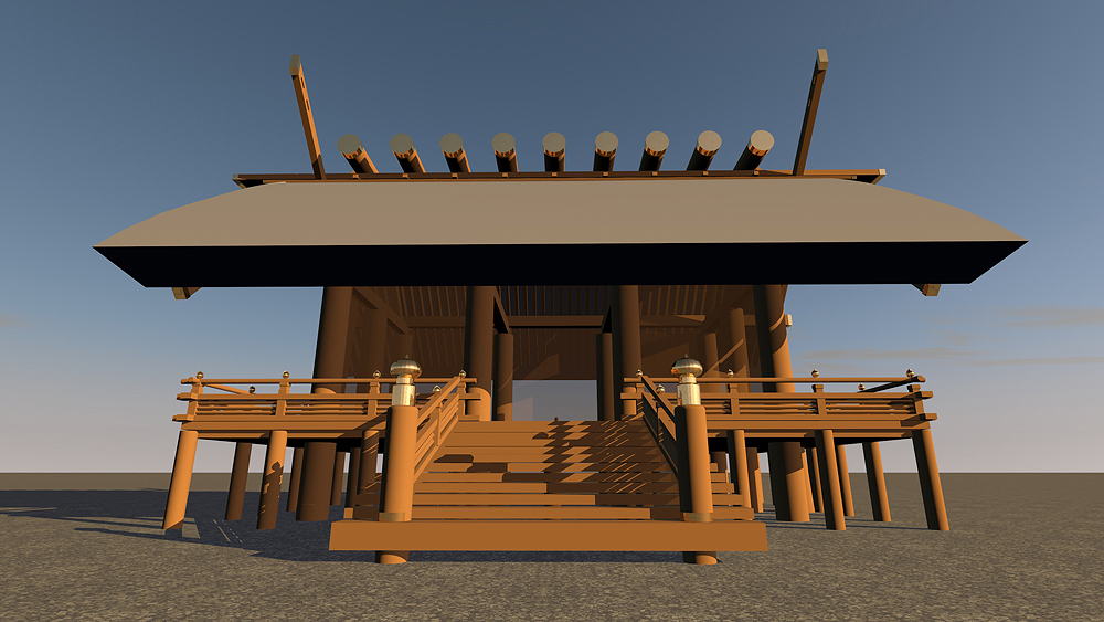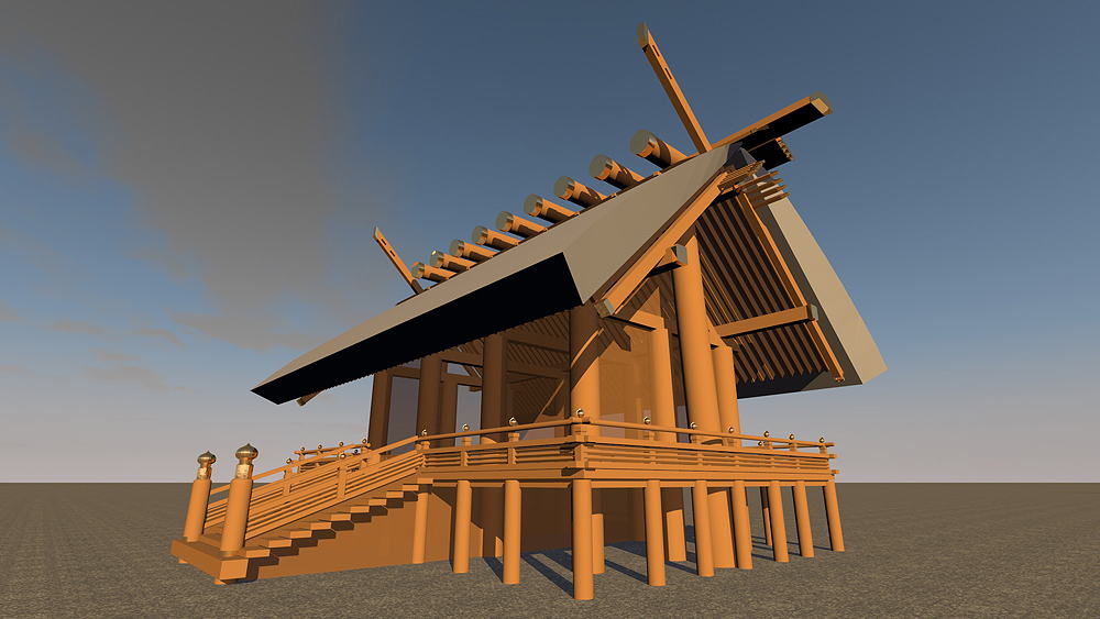 Shinto Shrine, constructed in 477 C.E., in Ise, Mie Prefecture, Japan. Shimmel architectural style; beginning in 690 C.E., the Ise Temples are demolished every 20 years, and rebuilt in replica on the adjacent alternate sites. Elevation is c. 8 meters (28 feet) above sea level. Materials of Construction: Wood structual elements, thatch roof. Data for CG model: |