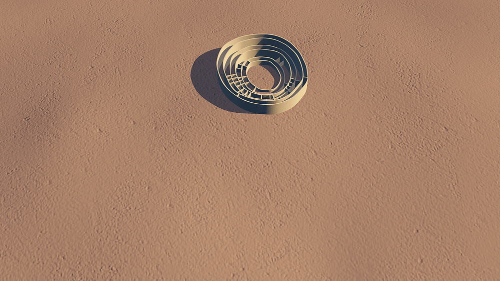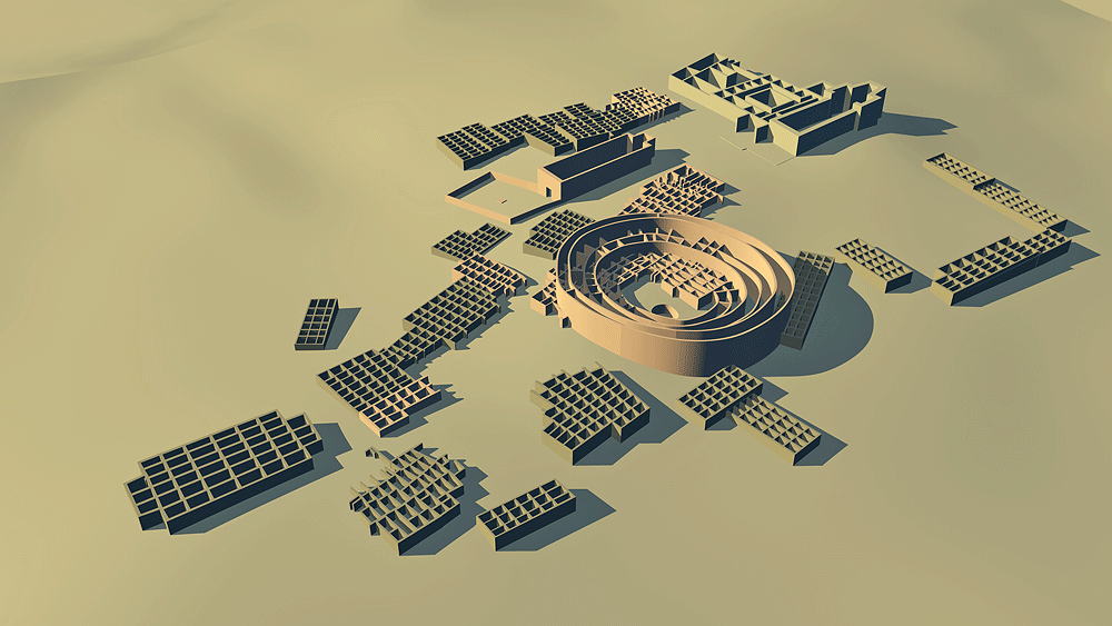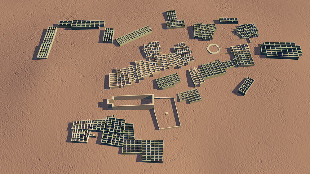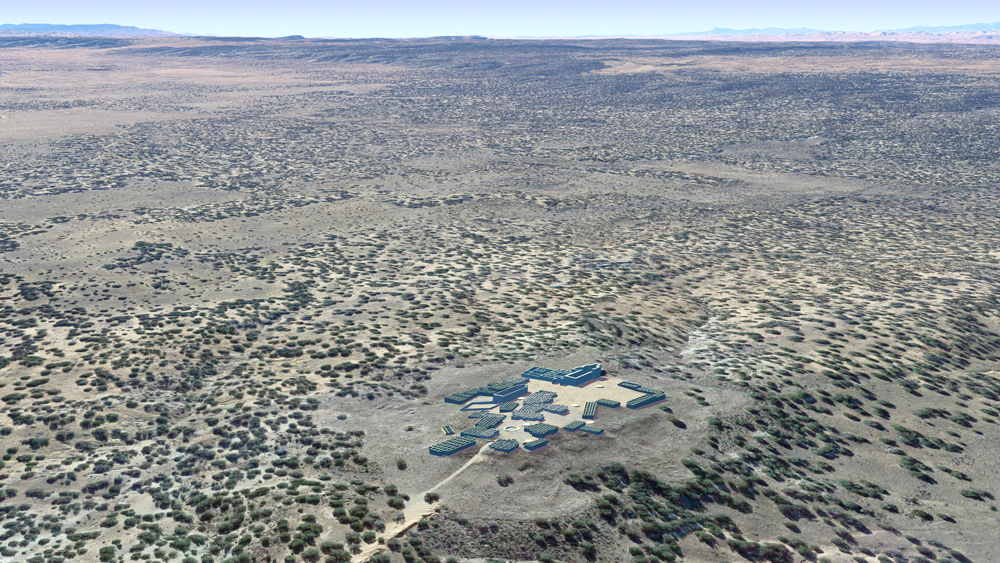 Photomontage of Gran Quivira Pueblo upon an aerial photo of the actual site.