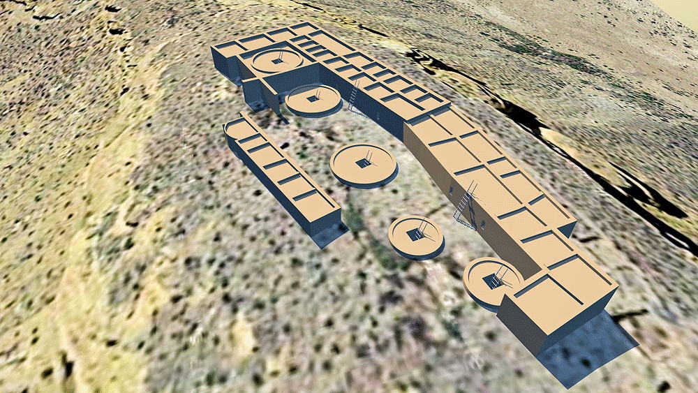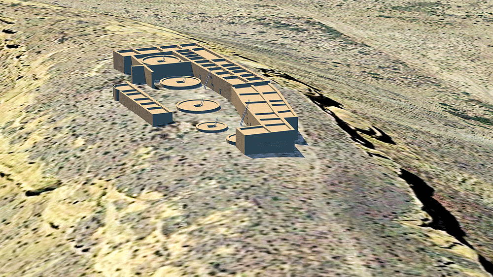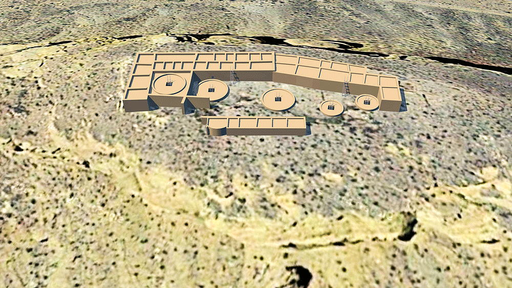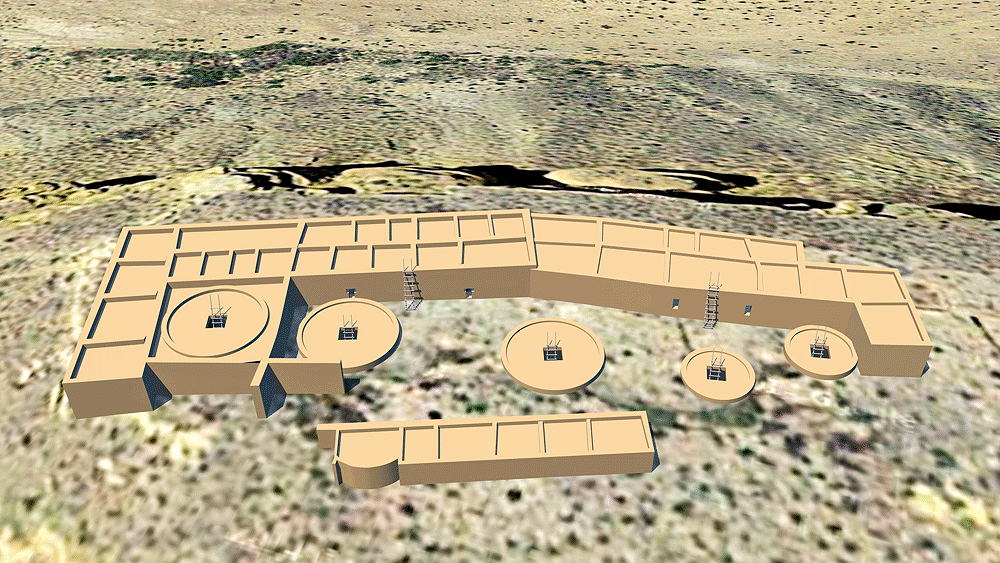 Chaco Culture, Chaco Culture Influenced, New Mexico, Constructed 1060 C.E. - 1220 C.E.; located 60 miles southeast of Chaco "downtown" Elevation is 1842 meters (6040 feet) above sea level. Materials: mortarless stone walls, wood log roof structure, with mud/clay roof. Data for CG model:1. Pippin, 1987 |
