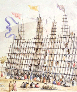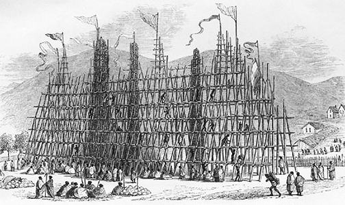 Above: "Stage for Hakari or Feast given to Governor Grey in 1849 at the Bay of Islands to celebrate the peace between the two races", illustration from 'The Story of New Zealand', by Surgeon-Major, Dr. A..S. Thomson. Moari Ancestral Culture, New Zealand, the Hākari Stage was constructed and used in pre-colonial times for ritual ceremonies, in which the entire structure was filled with gigantic amounts of foods to be given to villagers and visiting groups, as a symbol of generosity. Elevation is close to sea level. Materials: huge trees were cut down, transported to the designated place, put up vertically as the main cores and surrounded by some supports creating a braced pyramidal construction as much as 30 meters tall, with a base about 10 m across; every 2.5 to 3 meters, wooden horizontal platforms were added - forming as many as 10 or 8 of these stories. Data for CG model: |