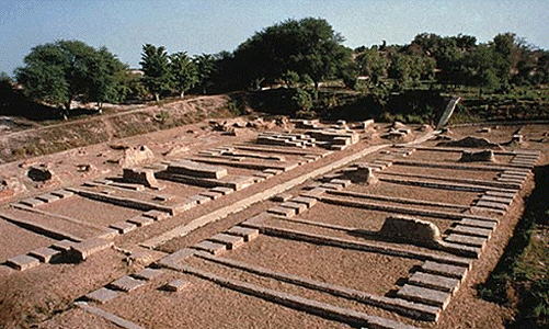 Indus Valley civilization, this large building, called the "Great Granary", located in Harappa, a Bronze Age fortified city, in west Punjab south of Lahore, emerged circa 2600–1800 B.C.E. along the Indus River valley. Archaeologists have not determined the original use of this massive fired brick structure, but there is speculation that it was a grain storage facility, with underfloor ventillation flues, and well ventilated hall where surplus grain was kept cool and dry.