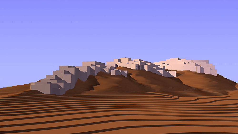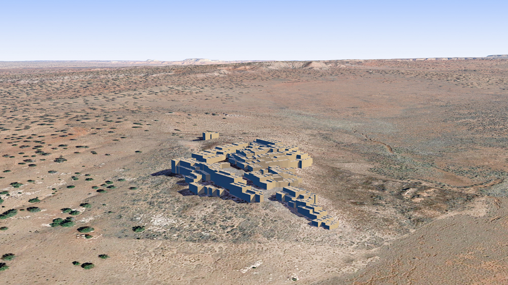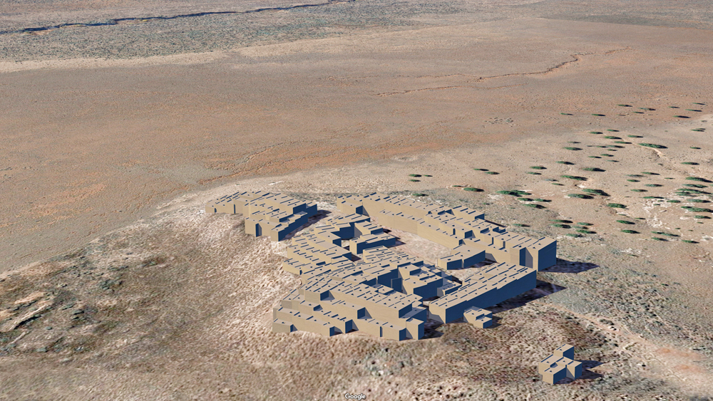 Photomontage of Hawikuh CG model upon aerial photo of actual site looking northeast. The Zuni Mountains are on the horizon in the left center.