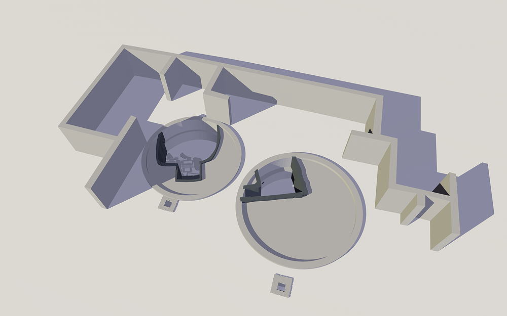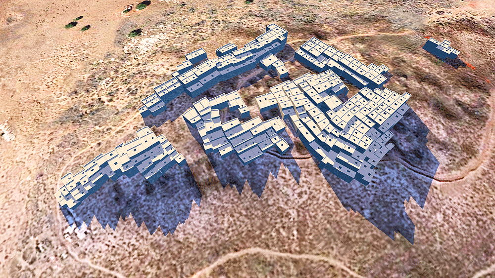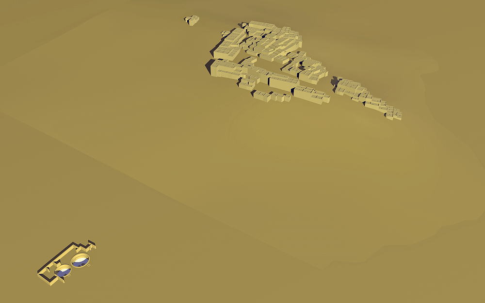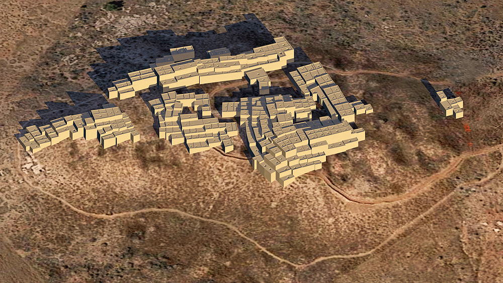 Photomontage of Hawikuh CG model upon aerial photo of actual site looking southwest. The ruins of the Catholic Church Mission, La Purísima Concepción, built in 1629, is below the Pueblo hill to the left.