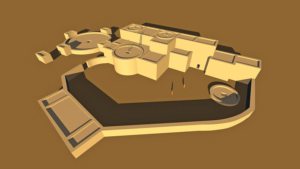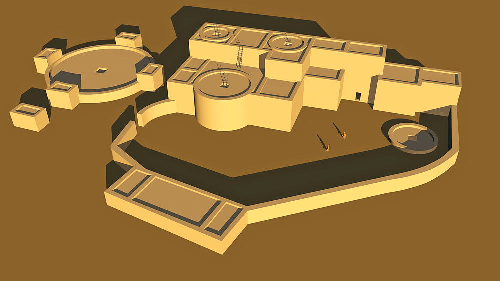Chaco Culture, Chaco Culture Influenced, New Mexico, Constructed 1060 C.E. - 1220 C.E.; located approximately 22.5 kilometers (14 miles) north-northwest of Grants, New Mexico and 72 kilometers (45 miles) due south of Chaco "downtown'". Elevation is 2127 meters (6980 feet) above sea level. Materials: mortarless stone walls, wood log roof structure, with mud/clay roof. Data for CG model: |