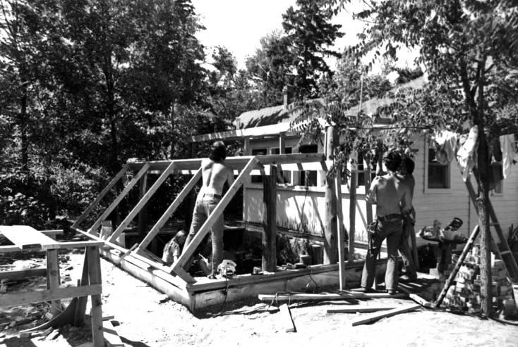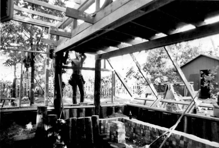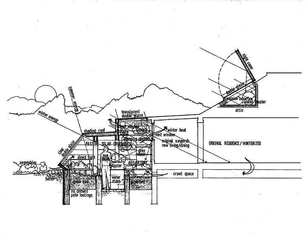 House of Essentials, Demonstration of Residential Energy Retrofit, Boulder Colorado College of Environmental Design, University of Colorado/Boulder, 1978 Professor Holloway's Energy Design Studio 4th-year students "solar-retrofitted" a small University-owned house witih a passive solar food producing greenhouse, and rooftop solar water heater. The passive solar "breadbox" water heater was produced with a recycled hot water heater tank under insulated glass with in-and-out piping connected to the house hot water supply line. An insulated reflective- metal-coated door closed at night kept the system warm. Construction materials for the project were donated by local Boulder businesses. |