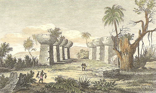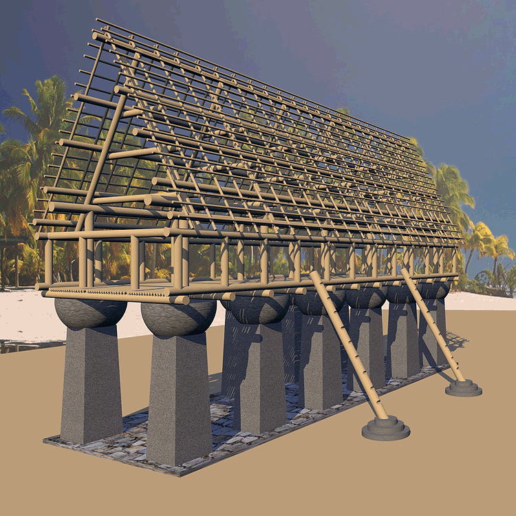 Chamorro Culture, Island of Tinian, United States Commonwealth of the Northern Mariana Islands, in the Marianas Archipelago, Latte Era, c. 1200 C.E. (? maybe much older). Elevation is close to sea coast. Materials:Supporting columns (latte) are composed of local limestone base and coral hemisphere capstones; wood is used for floor beams and joists, wall columns, purlins and rafters; thatch roof. Data for CG model: