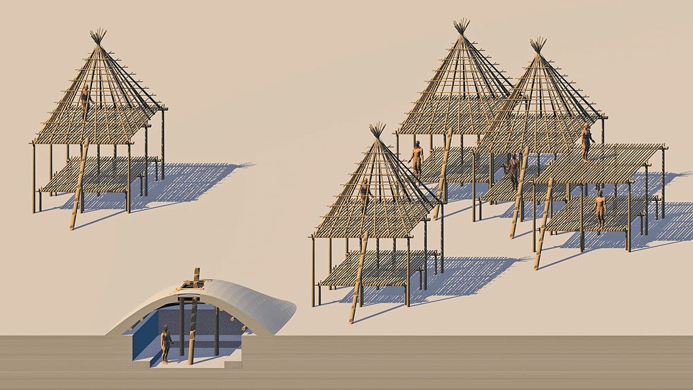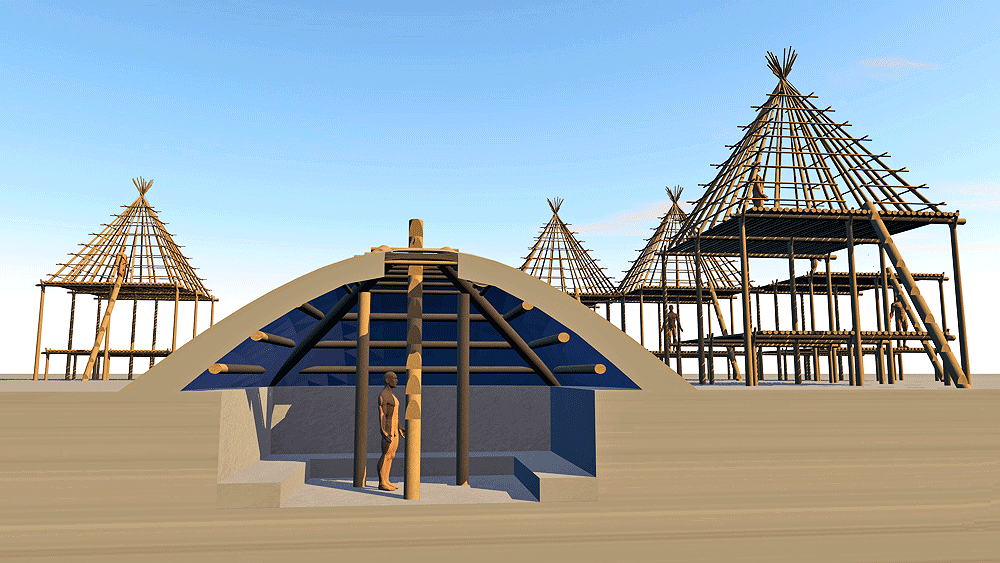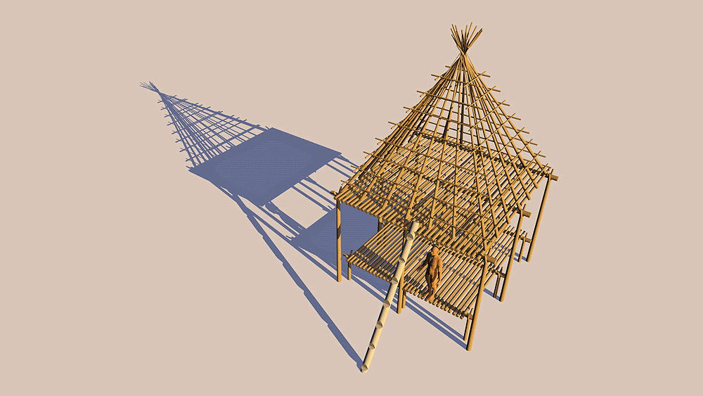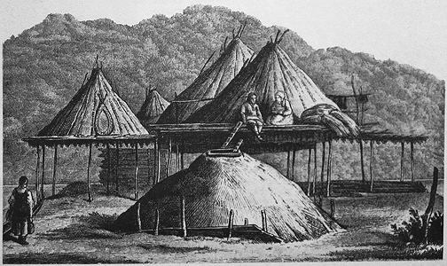 Materials: summer house: wood piers, beams and pyramidal roof structure covered with skins; winter pit house: wood structure supporting roof of sod and moss.