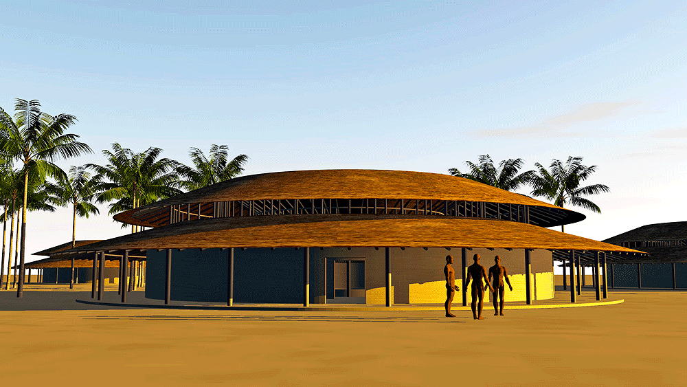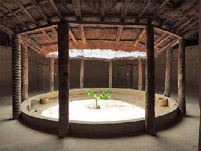 Jola (or Diola) culture traditional house type is located in coastal rain forest Casamance Region of Senegal, western Africa; it evolved from ancient times, and is still in use today. The mud brick walled circular plan consists of a ring of rooms surrounding a central court, the impluvium, accessed by passages from the outside. The roof form inverts at a ridge, with slopes to the outside and the inside impluvium of the house. The opening of the inside sloping roof, the compluvium, results in rainwater being collected for drinking in the central low-walled cistern. Employing the principle of evaporative or "swamp" cooling, water in the central cistern evaporates, and in the process transfers heat from the house air to evaporate the water, giving in return cool moisture-laden air inside the house. The thatch roof shades the thick mud walls from solar heat gain, increasing their heat absorption and cooling effect on the interior house air. Entrance to the ring of rooms is from the central court, thereby trapping and conserving the coolness—a sophisticated example of sustainable architectural design principles. Compluvial / Impluvial architecture is also used by the Igbo, Yoruba, and Edo cultures of southern Nigeria, and was used as well as by the ancient Greeks and Roman Pompeii.