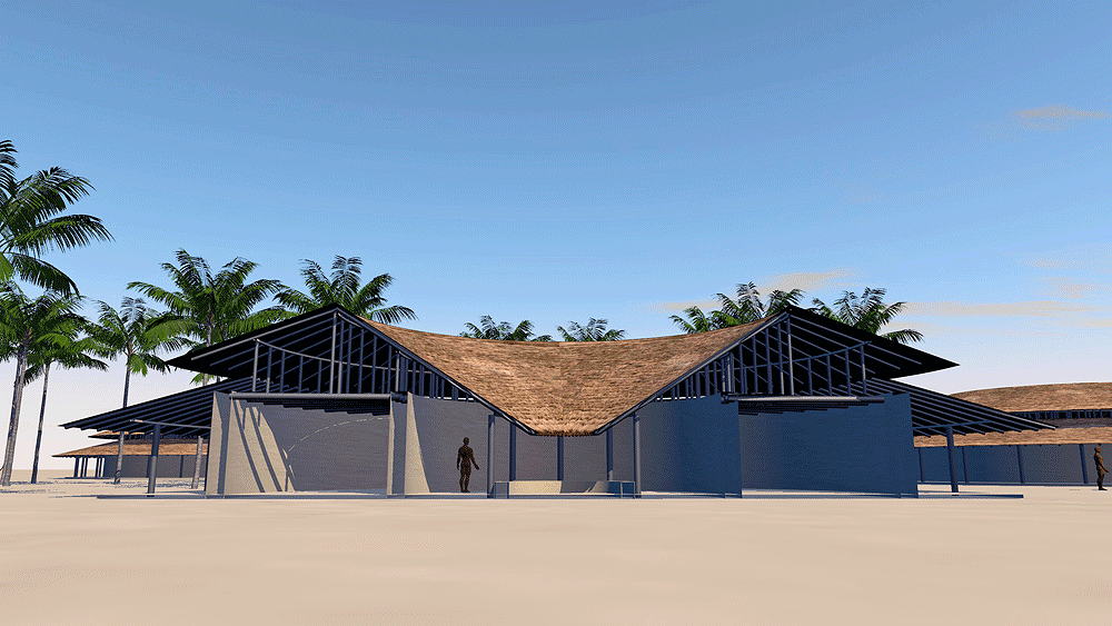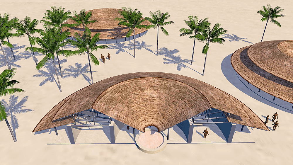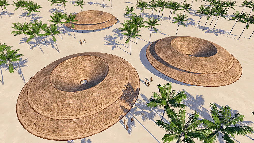 Material: thick walls of sun dried mud bricks and stabilized mud plaster, wood roof structure with thatch roofing.