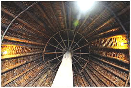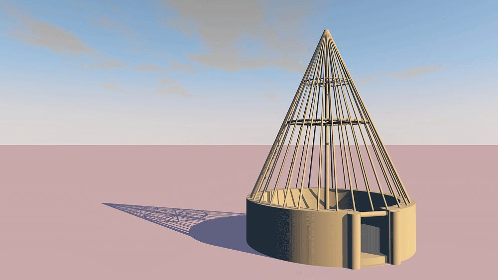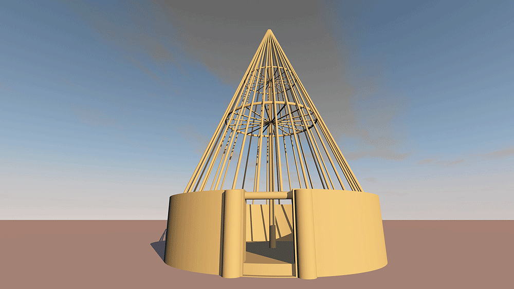 Materials: Wood columns, central pole and support ring, purlins, with stone wall infill between wall columns.