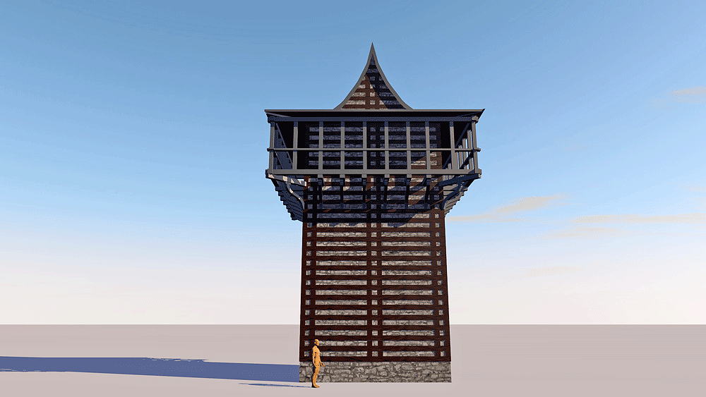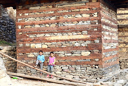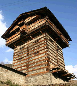 Hindu Temple and domestic architectue of Himachal Predesh and Uttarakhand, India; Himalayan construction technique evolved over centuries to withstand powerful and frequent earthquakes. Construction technique influenced many other cultures along the Silk Road. Alternating stone and wood layers in the walls gives the architecture flexibity to withstand seismic forces. In use from ancient times to present. Elevation is c. 2010 meters (6600 feet) above sea level. Materials: walls of deodar (from Sanskrit devadāru 'divine tree') cedar and kail trees, and mortarless local stone; main floor is adobe over stone plinth; upper floor wood planks. roof slate or wood shingles. Data for this CG model from: |