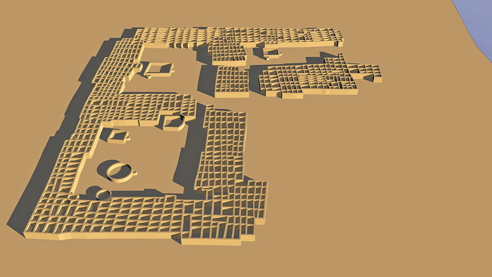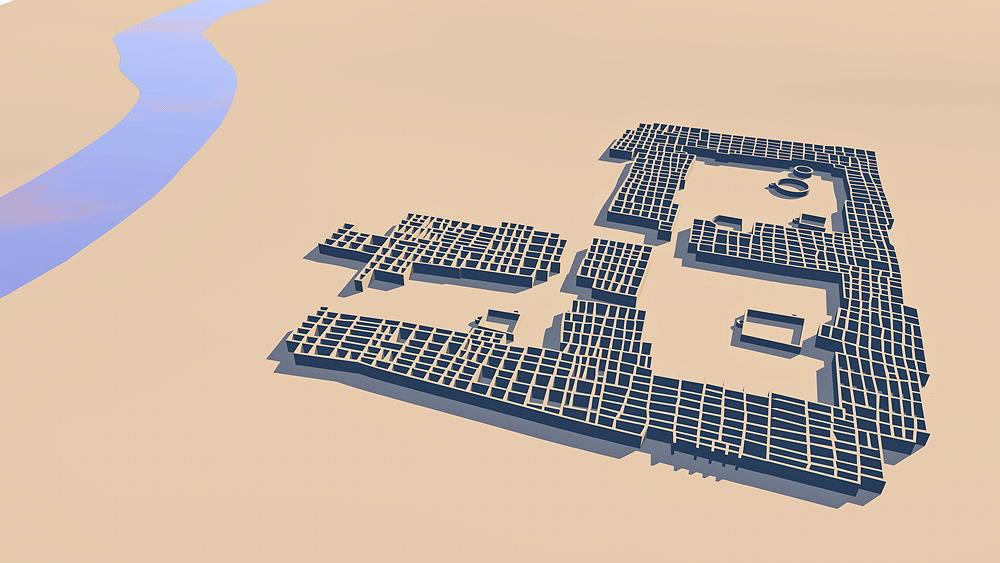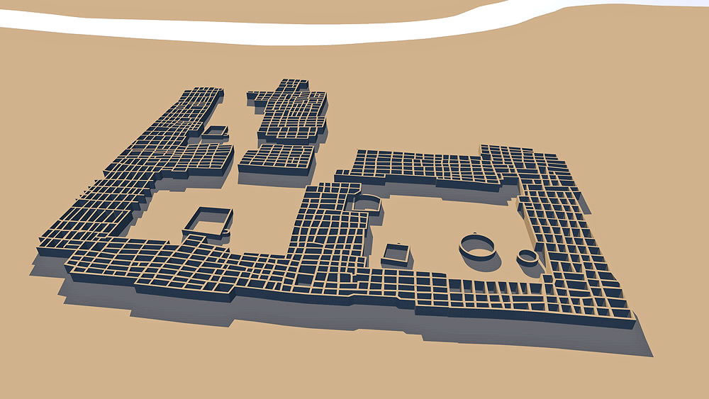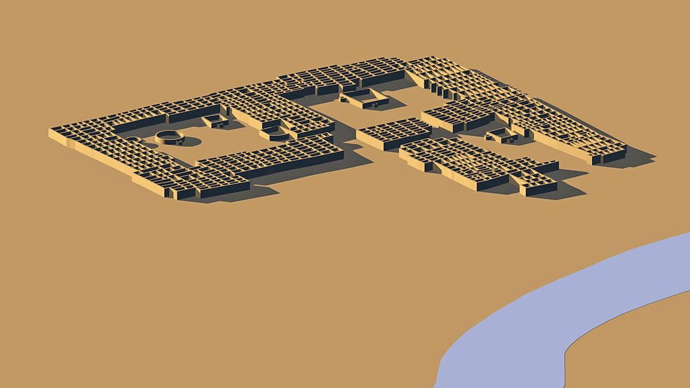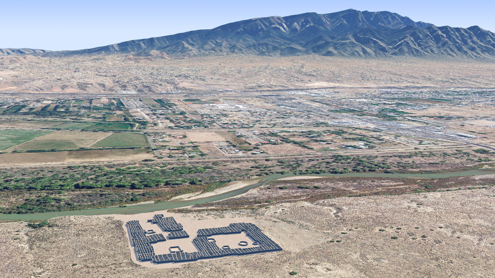 Photomontage of CG model of Kuaua Pueblo upon aerial photo of actual site looking east over the Rio Grande, modern city of Bernalillo, New Mexico, and the Sandia Mountains beyond.