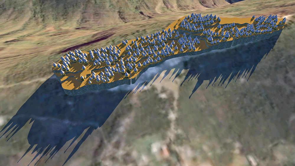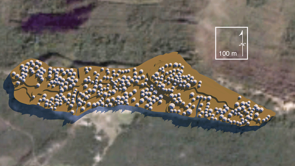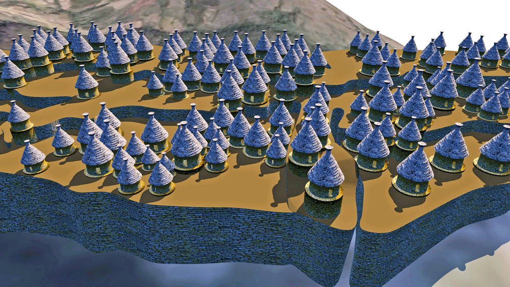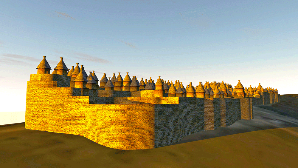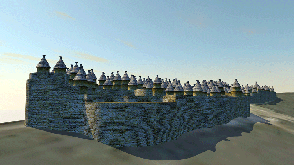 The Chachapoyas culture ancestral walled citadel of Kuélap is located on a mountaintop limestone ridge at elevation 3000 meters (9842 feet) on the west bank of the Utcubamba River, district of Tingo, Luya Province, Amazons, in northern Peru. Covering an area of 15 hectares (37 acres), the site has over 550 circular structures, and may have had 300,000 inhabitants. The inhabited area, sits atop an 18 meter high (60 feet) walled table, which is entered through three narrow stair cuts, one of which narrows to allow only one person to enter at a time. Considered the largest stone ruin in the Americas, Kuélap's outer wall, a shell filled with rubble core, is comprised of massive limestone blocks nearly 10-times the volume of the blocks used in Egypt's Giza Great Pyramid. According to archaeologists, the majority of structures were built between 900 CE and 1100 CE., but it is a controversy whether Kuélap was built as a defense against the surrounding tribes of the Huari culture. The citadel was abandoned in 1570 CE during the Spanish conquest. Elevation is c. 3028 meters (9933 feet) above sea level. Materials: The outer citadel wall is a limestone block wall casing containing a rubble interior; the residential and ceremonial architecture is composed of limestone walls with thatch roofs. Data for CG model: