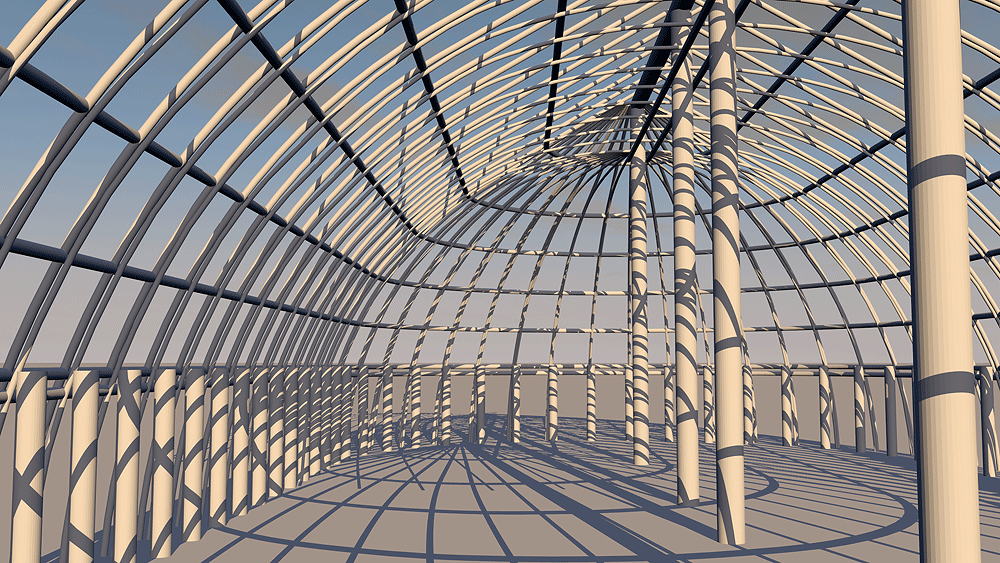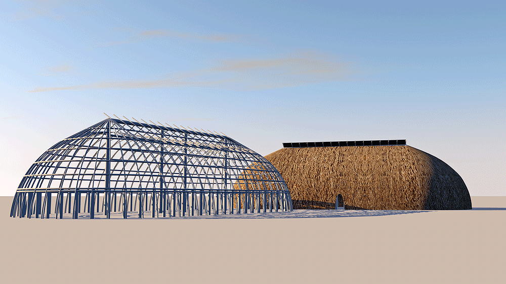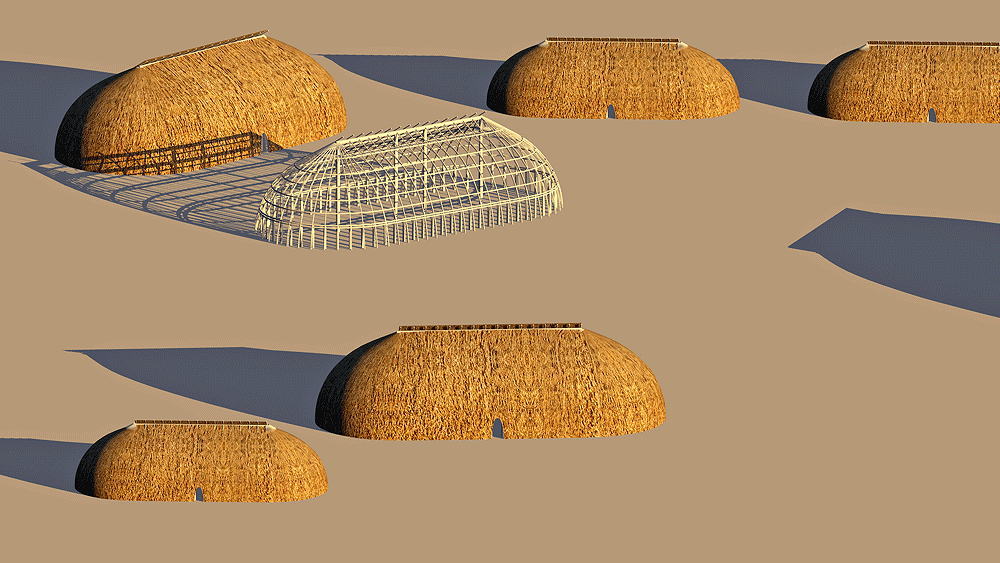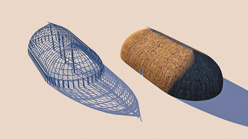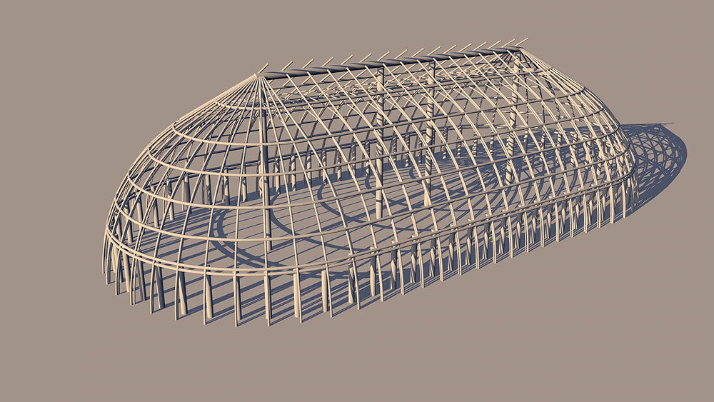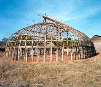 Materials: wood columns, wall frames; wood wood beams, rafters, and purlins for roof structure; thatch roof.