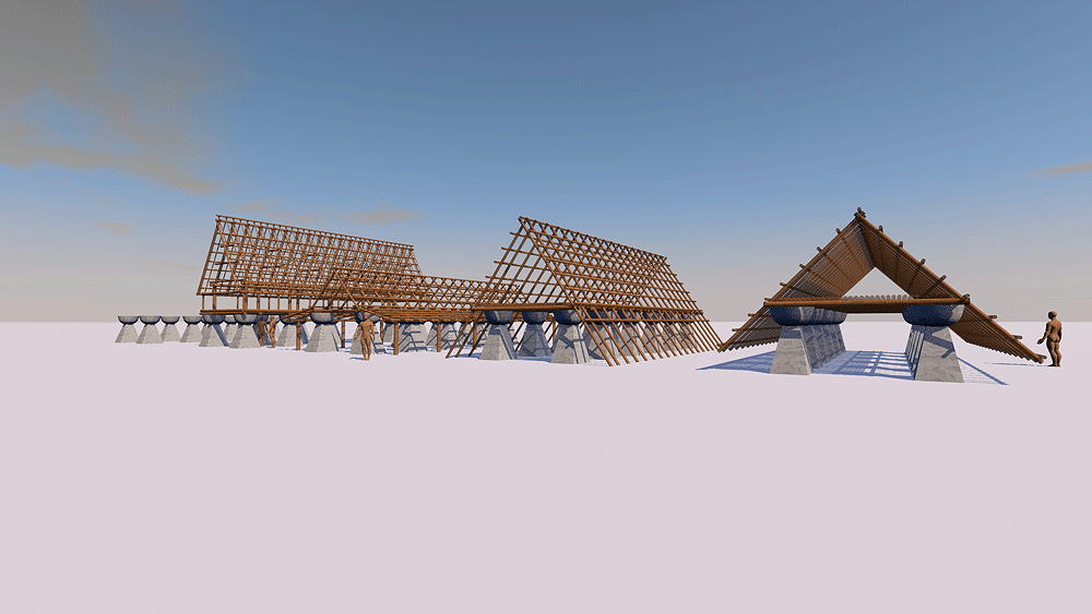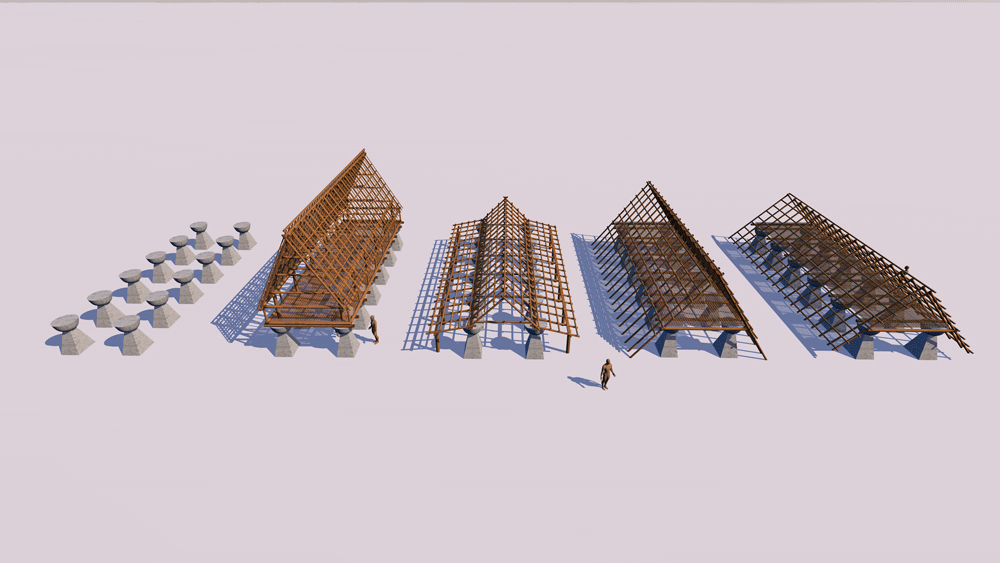 Chamorro Culture, Island of Tinian, United States Commonwealth of the Northern Mariana Islands, in the Marianas Archipelago, Latte Era, c. 1200 C.E. (? maybe much older). Elevation is close to sea coast. Materials: Supporting columns (latte) are composed of local limestone base and coral hemisphere capstones; wood is used for floor beams and joists, wall columns, purlins and rafters; thatch roof. Data for CG model: |
