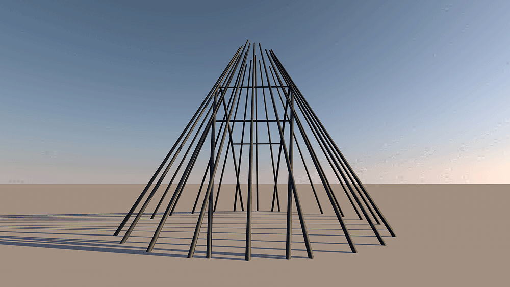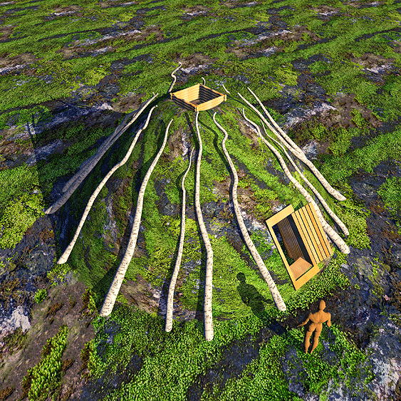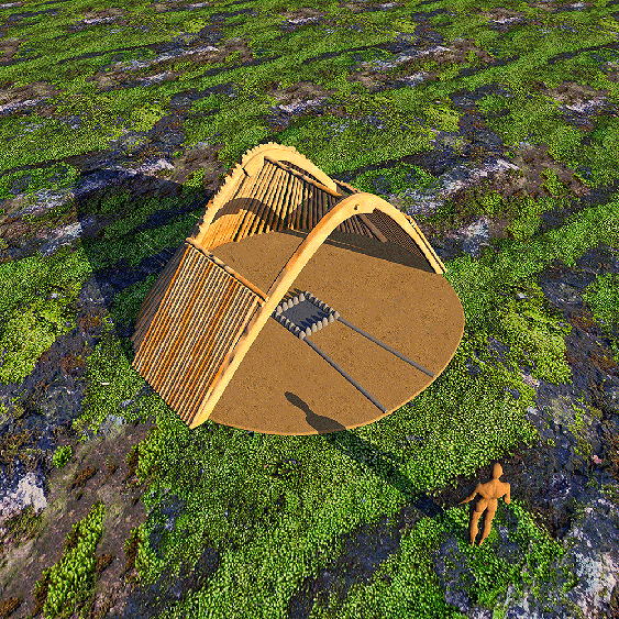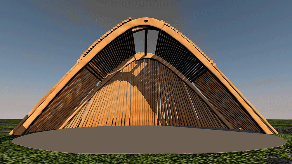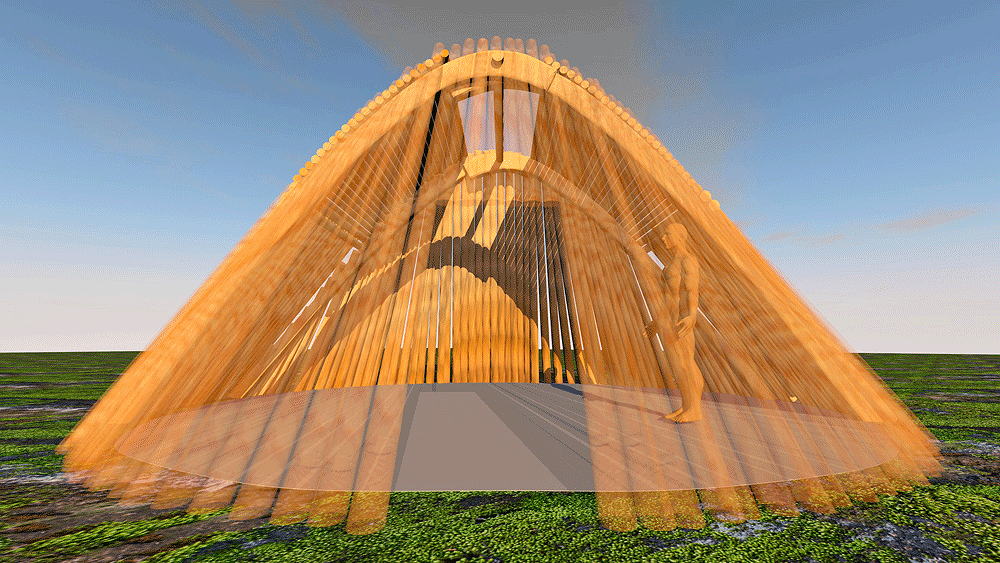 Sámi (Sápmi) culture, whose ancestors are a Uralic people from the Volga region of present-day Russia, are now indigenous to northern parts of Norway, Sweden, Finland and the Kola Peninsula within the Murmansk Oblast of Russia. There is no official geographic definition for the boundaries of Sámi. They are traditionally semi-nomadic fishers, trappers, and herders of sheep and reindeer. During the Bronze Age (c. 3200–600 BCE), Sámi people migrated into the coast of Norway (Finnmark) and the Kola Peninsula of northwest Russia. They do not refer to themselves as "Lapplanders". Sámi traditional temporary dwelling architecture is similar to the Native American tipi form (see pages ). Both dwelling types allow for a migratory nomadic lifeway. The fabric covered tipi looks very similar to a Sami lavvu, but often constructed slightly larger. The wisdom of both structures lies in their ratios of minimum exposed surface areas (for heat loss) to internal air volume ratios. The lavvu/goahti has an inherent structural stability resulting from its ubiquitous integral structural triangulation. There is no center pole needed to support this structure. The self-weight of the sod covered goahti makes staking-down unnecessary. There can be three types of covering for a Sami lavvu/goahti hut or tent: fabric, peat moss or timber. Until the mid-19th century when inexpensive manufactured British textiles were made available to the Sami, Reindeer hides had been used as a cover. Lavvus can be very large with with enough room for dozens of people and housing large families. Located in the middle of the lavvu interior is a fireplace used for heating and to keep mosquitoes away. The smoke escapes through the smoke hole in the top, usually left open, and to prevent smoke from building up inside, proper air circulation is maintained by open vents open along the lavvu base, or leaving the door slightly open. The building stages of a Sami arch-beamed goahti (turf home): First an inner framework of two sets of curved wooden beams, are erected and braced with tree dforks. The curved trees used for these grow on hillsides. This structure of hyperbolic arches sits on stones with the final weight of the turf and its profile providing stability. The frame is pegged together with a wood ridge pole without the use of nails. Round wood poles are laid against the frame, pegged, and covered with overlapping sheets of birch bark, which are kept in place by the layers of turf stacked against the sloping walls. Construction Sources of data for CG models: |