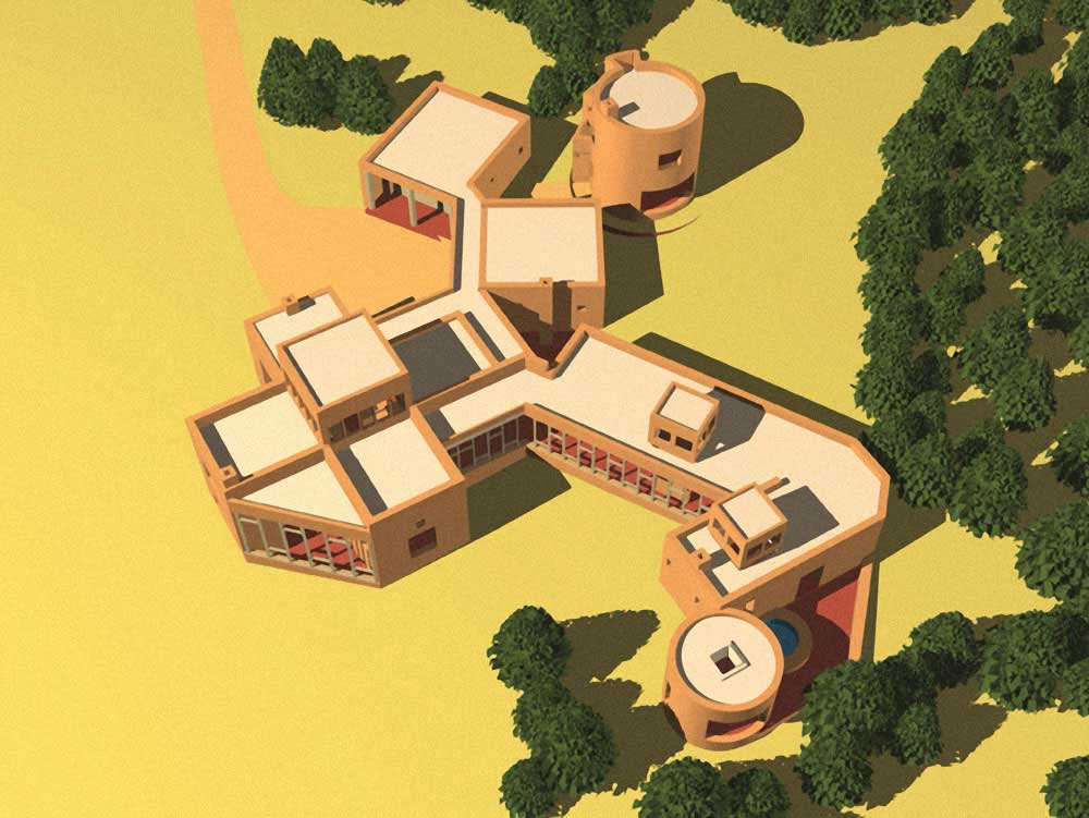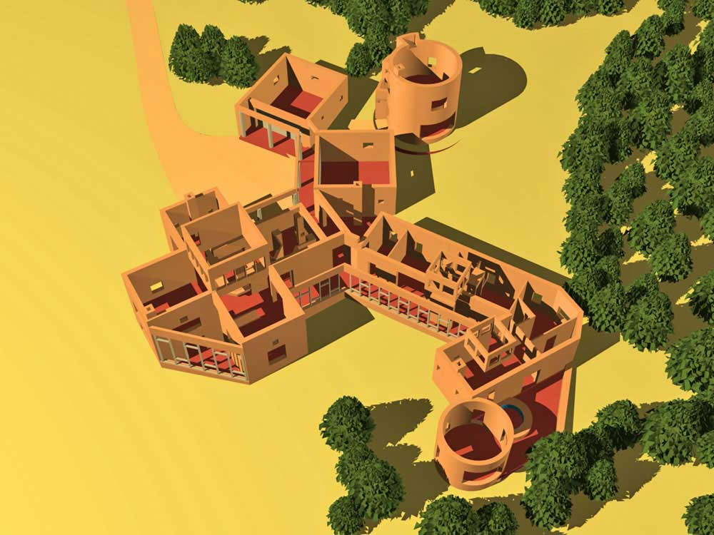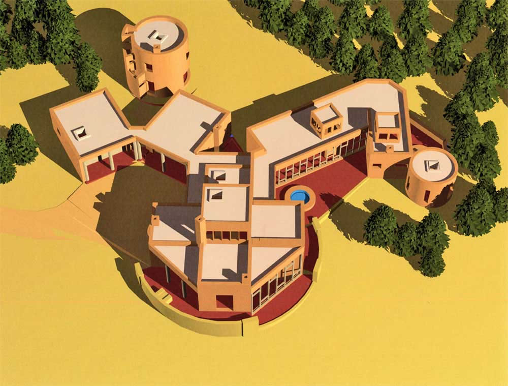 A passive solar adobe house to be built in the Eastern foothills of the Southern Rocky Mountains. Designed in the Pueblo Native American idiom, the house employs two naturally ventillated passive solar sunspaces as the primary space heating / ventilating elements. The clients' goal is to develop the energy support systems to be off-grid in near future.