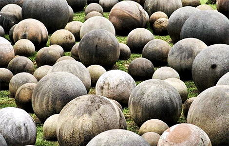 Pre-columbian Bribri and Cabecares indigenous houses (palenque?)constructed c. 1150 C.E. Located in FInca 6, Delta of the Diquís River (originally called Térraba River), Costa Rica. One house entrance is oriented northwest (toward the direction of a plaza of stone spheres), the other to southeast. Stone spheres of 1.10 meter diameter were found near the corners of the trapezoidal access ramps. The houses, and crescent shaped porticos sit upon platforms of river rock 1.5 meters high. The ramp has a limestone floor. Interior columns are in an octagon formation rather than circular. Elevation is c. 11 meters (35 feet) above sea level. Materials of construction: wood structure, thatch roof, river stones for base platform, portico, and ramp. Data for CG model: