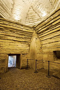 Neolithic Scottish culture, chambered cairn and passage tomb, located on Mainland Orkney, Scotland near Skara Brae; it was built c. 3000 BCE to 2800 BCE, using carefully crafted stone slabs weighing as much as 30 tons. The entrance passage which is 3 feet high and 36 feet long leads to the central nearly square chamber measuring 15 feet each side, and covered by a beehive shaped vault (which had partially collapsed). The culmination and height of the original roof vault is therefore unknown. The corners of the central room are 'buttresses" composed of large standing stones and flat stacked stones. Maeshowe is part of a designated World Heritage site.