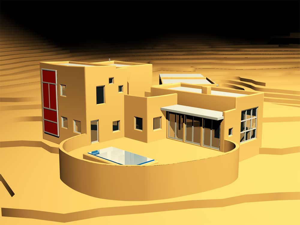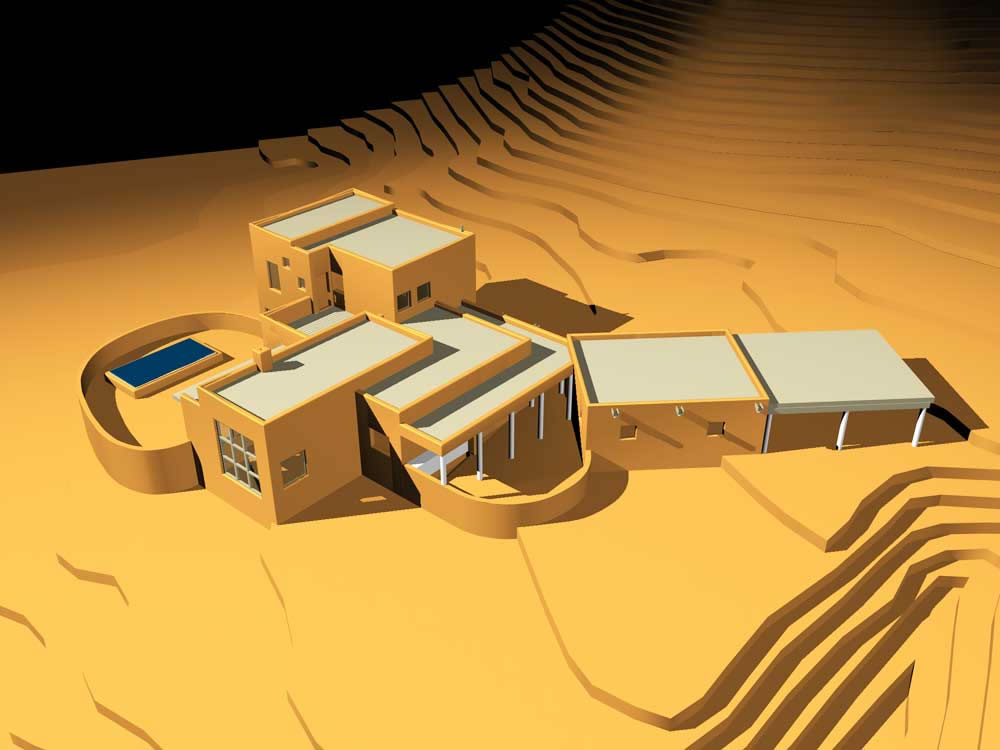 Mellon Residence features a solarium and Trombe wall. Computer model looking southwest.