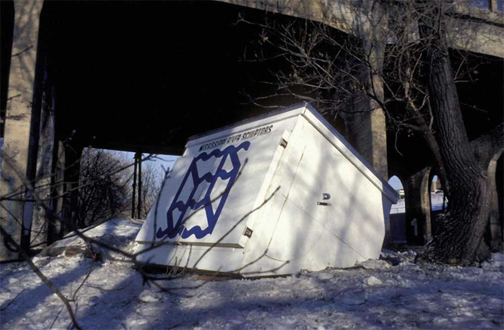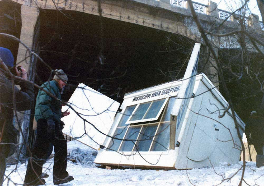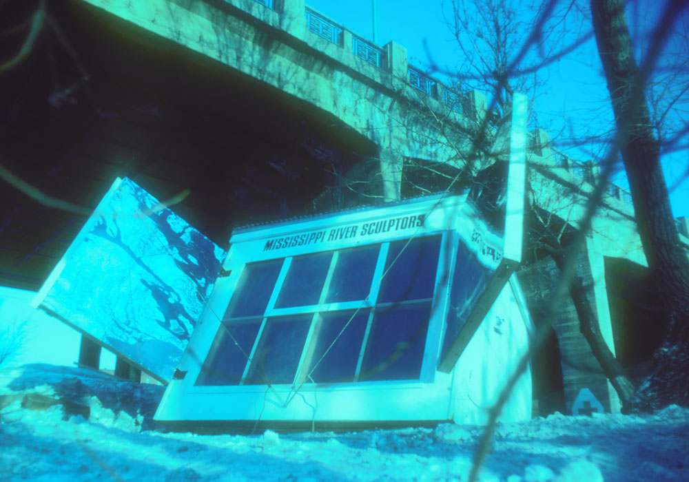 Survival Shelter for Mississippi River Sculptors College of Architecture & Landscape Architecture, University of Minnesota, 1976 Professor Holloway assigned his Energy Design Studio 4th-year students to design, construct, and deliver a passive solar survival shelter for a group of sculptors who were struggling to continue their art work, during the cold season, under the Hennepin Avenue Mississippi River Bridge, in downtown Minneapolis. The super insulated shelter inspired by the"land of lakes ice fishing house", was modified with a sloped south- facing multii-layered fiberglass-glazed wall. The south wall was insulted at night with closeable panels. The panels, opened during the daytime, were covered on the inner side with reflective metal, which amplified the solar incidence onto the glazed wall. Construction materials for the project were donated by local Twin Cities businesses. |