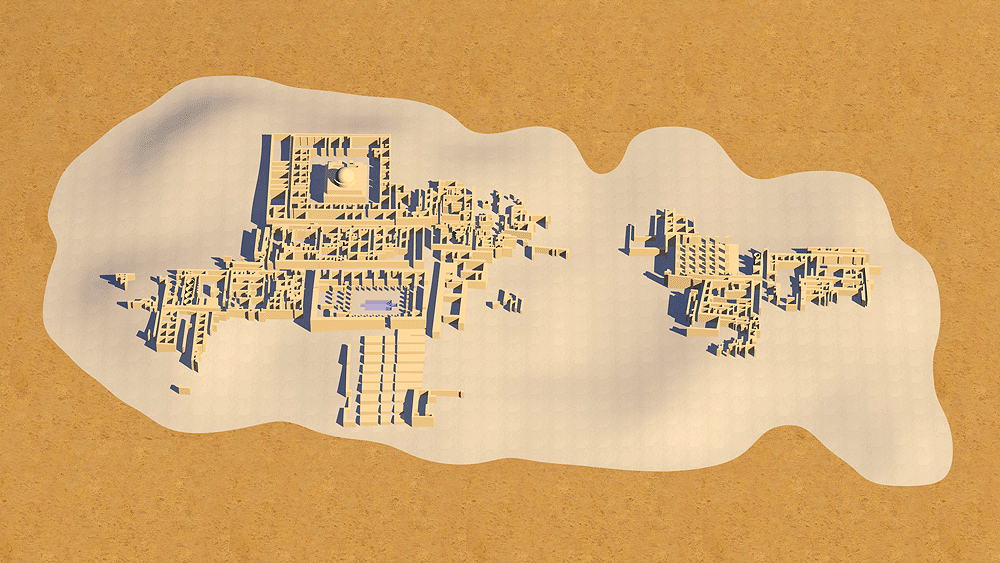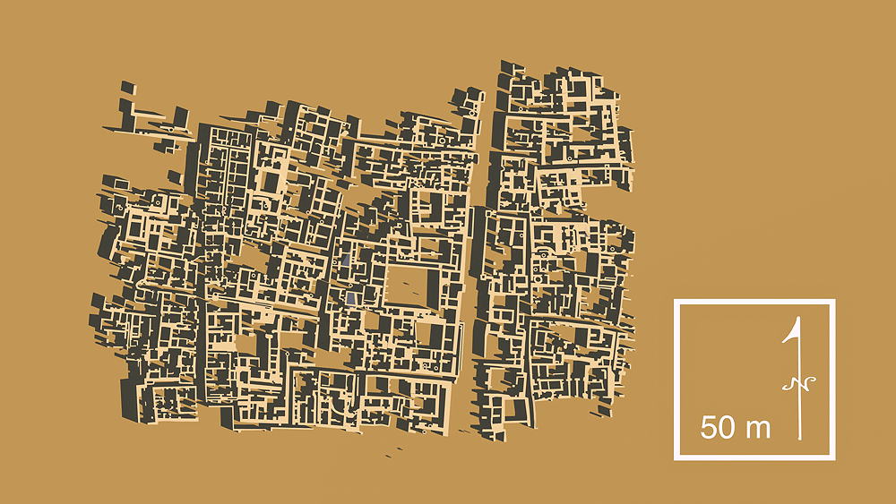 Harappan Civilization early urbanism located on the Indus River in Sindh Province, near the town of Larkana, Pakistan, beginning in 2400 BCE and abandoned in 1800 BCE. Earlier Indus Valley civilization founded settlements here from the 4th millennium BCE. The city was divided into an Citadel elevated 12 meters (40 feet) above valley floor, and Lower City close to river level. The Citadel contains a Buddhist stupa and surrounding monastery (founded 2nd century CE), Great Bath, Great Granary, Great Hall, and College Hall. The Lower City had a central marketplace and water well. There were approximately 700 small circular water wells (invented by the Haappans), a water supply system, and covered street-side sewage and waste water channels. Most residences, some two stories high, had central courtyards that opened to off-street side alleys. Mohenjo-Daro was not heavily fortified with defensive walls. The residential areas of the Lower City were built upon large earthen platforms. Many copper and bronze artifacts (produced using lost wax technology) were found during excavations at the site. Elevation of the Citadel is c. 54 meters (178 fteet) above sea level. Materials include fired and sun dried mortared brick and wood roof structures. Bitumen was used as a water sealant in the Bath and in roof construction. Data for CG Model: |