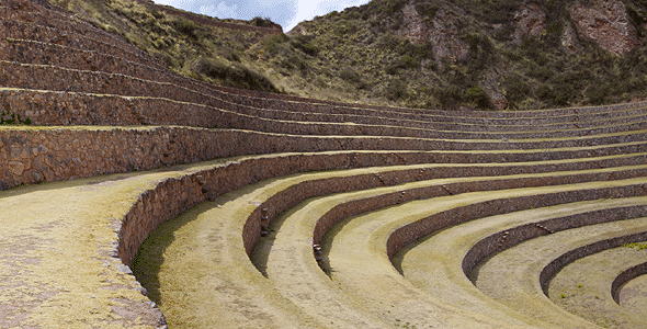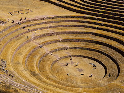 Inca Civilization; constructed from c.1450 C.E. to 1515 C.E. and abandoned by 1534 C.E. these monumental structures (muyus), build over ancient sinkholes, remain a complete mystery as to their purpose. Some archaeologist believe these concentric circular terrace depressions to be an kind of agricultural experiment station, due to the temperature gradient that occurs from top to the more than 100 meter depth; located 22 miles northwest of Cusco, Peru, at the base of Wanumarka Mountain at an elevation of 3500 meters (11,500 ft.).