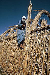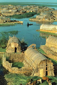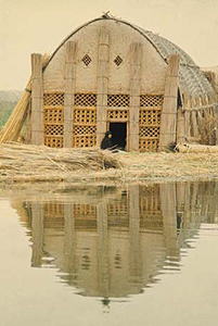 Marsh Arab (Maʻdān) Culture; first written record, 9th century C.E. but origin date unknown; vaulted houses with arches, beams, purlins, and roofing made from bundled local reeds bent into arches, located on artifial islands of reeds and mud, in the Tigris-Euphrates Rivers marshes, south and east present-day Iraq.
